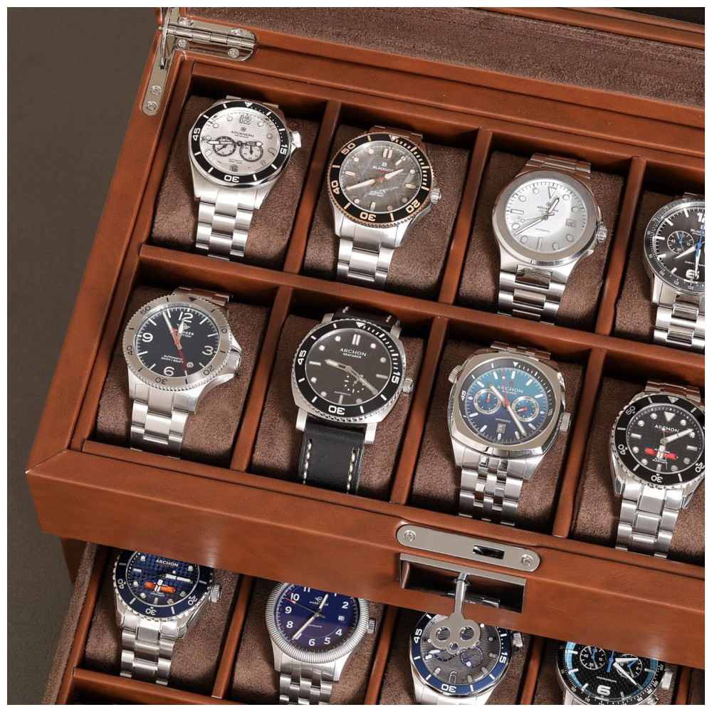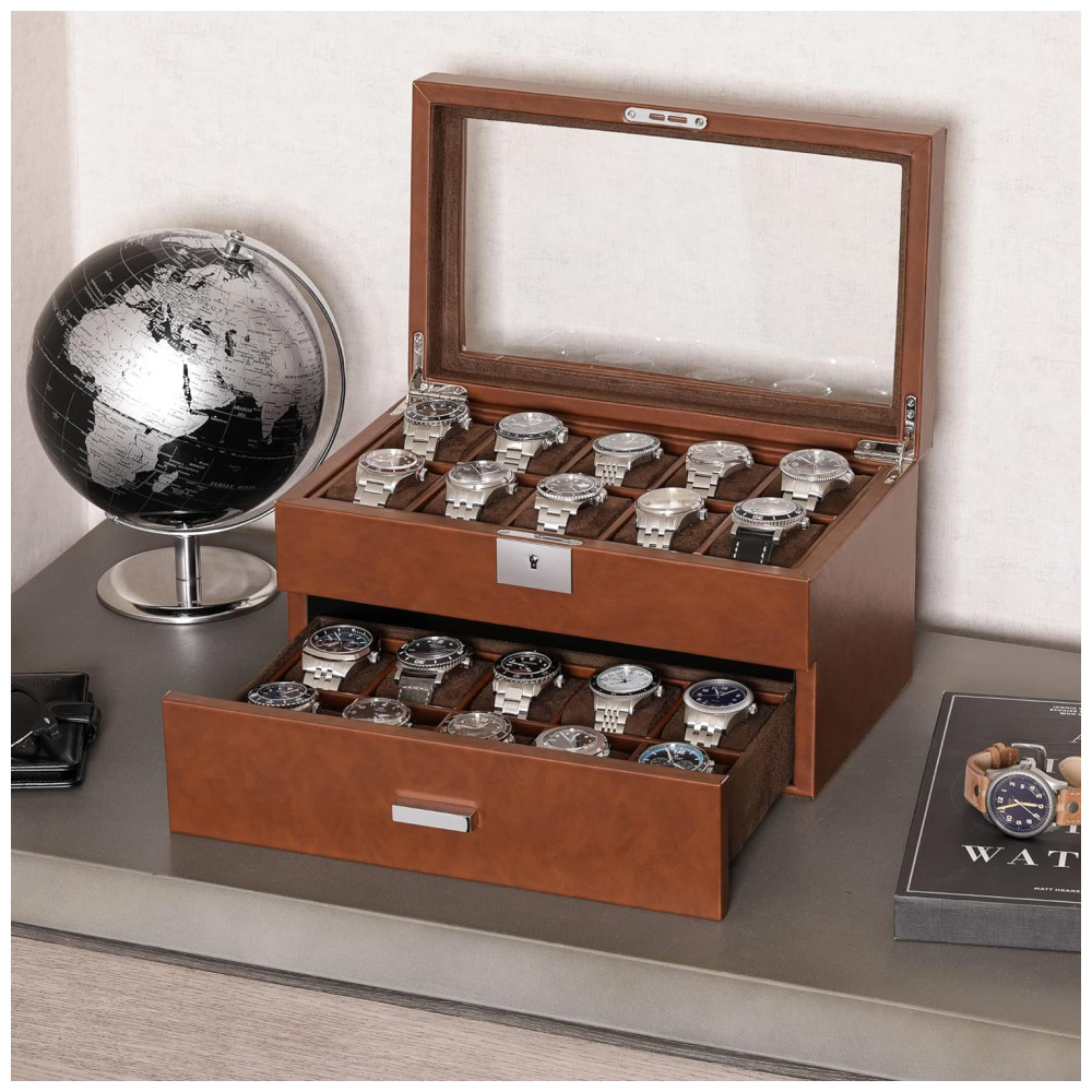 20 SLOTS Com vinte 20 porta relógios, nossa caixa de vidro oferece muito espaço para zenar toda a sua coleção de relógios. Nosso organizador de porta relógios parece simplesmente fantástico enquanto atua como um lindo e deslumbrante estojo de zenamento.