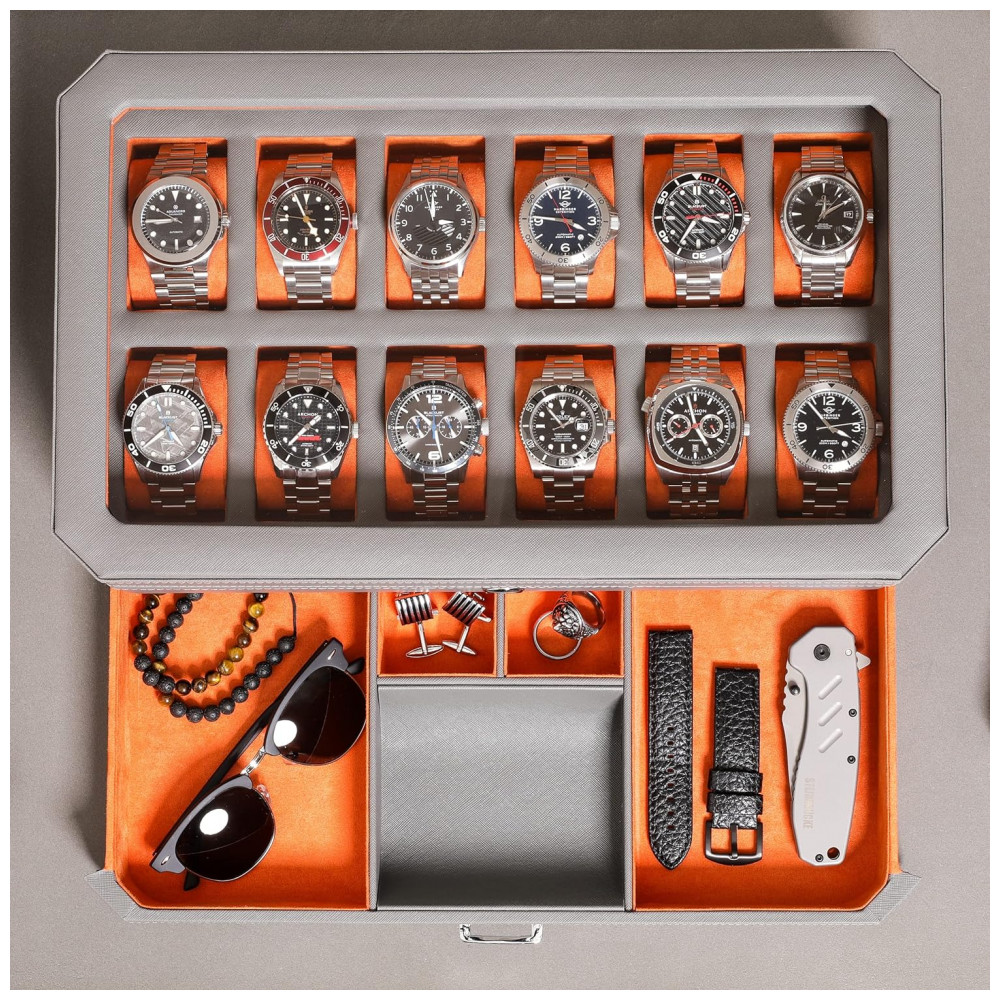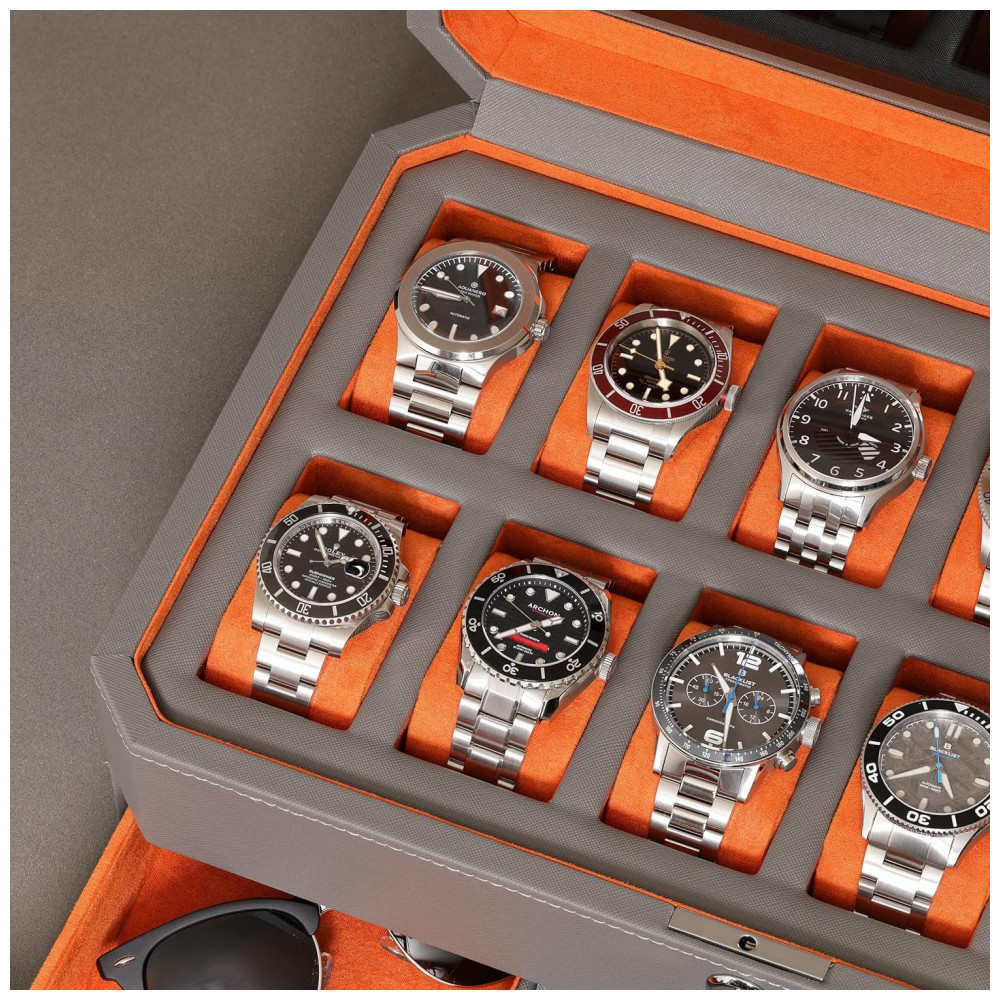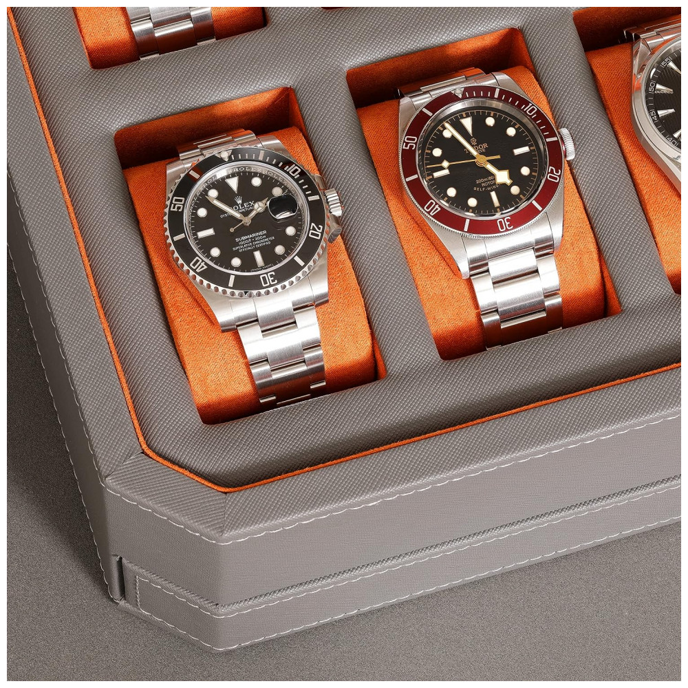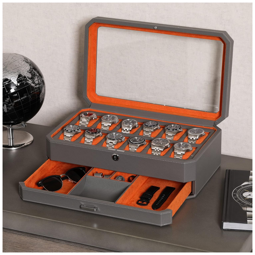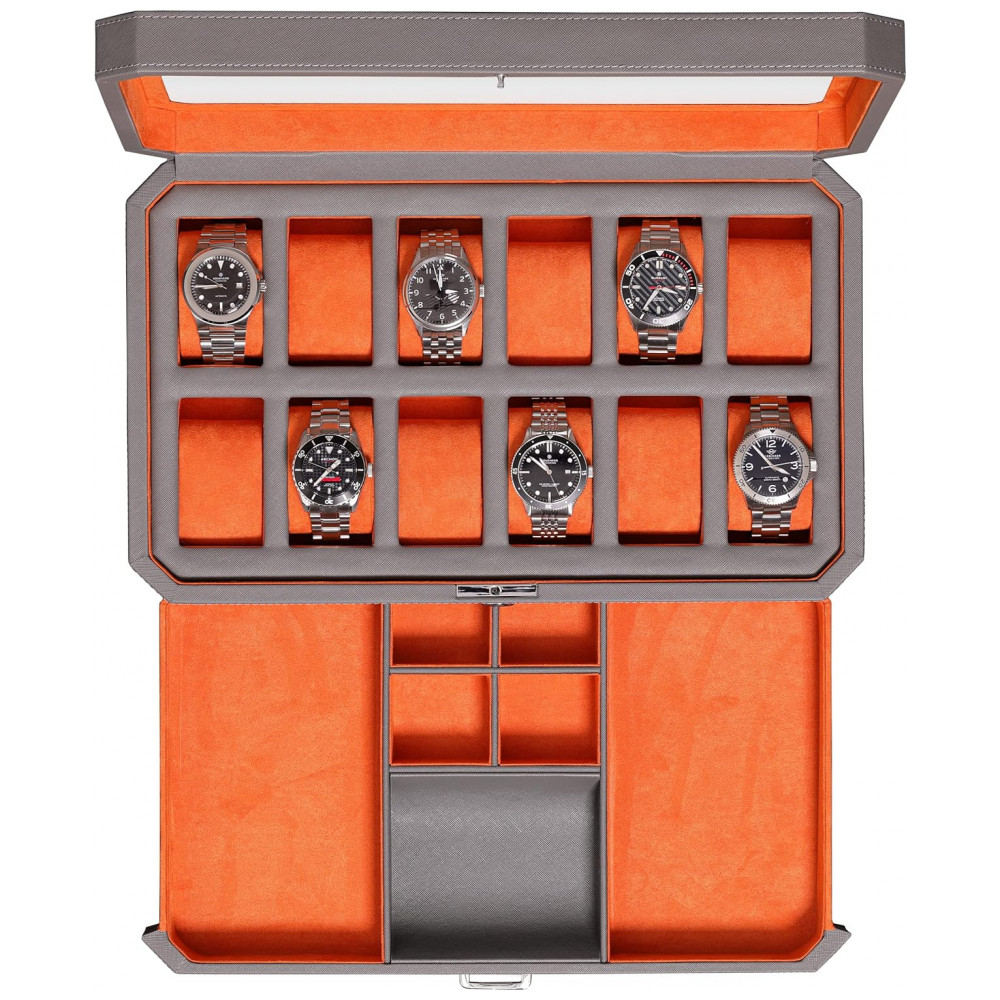 Caixa Estojo de Couro e Visor de Vidro para Relógios com 12 Compartimentos ROTHWELL Cinza e Laranja
