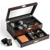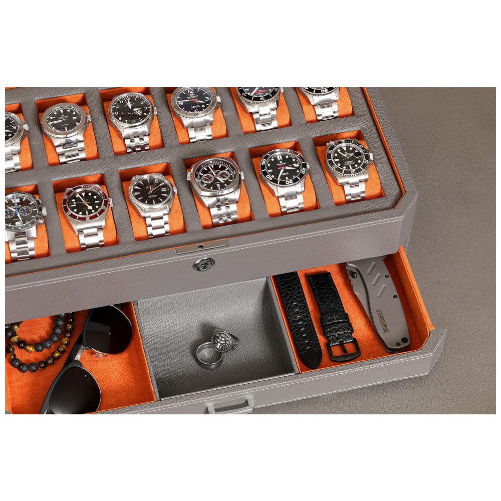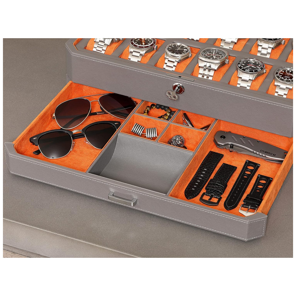GAVETA VALET A gaveta deslizante em nossa vitrine de relógio pode conter relógios adicionais e pulseiras de relógio ou fornecer espaço extra para manter suas abotoaduras, anéis, prendedores de gravata, óculos de sol, canetas, dinheiro, cartões ou ferramentas de relógio.