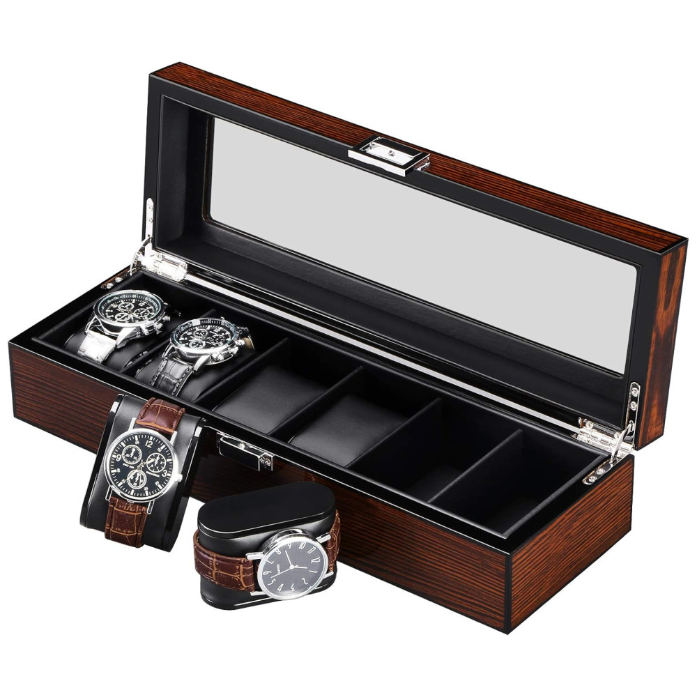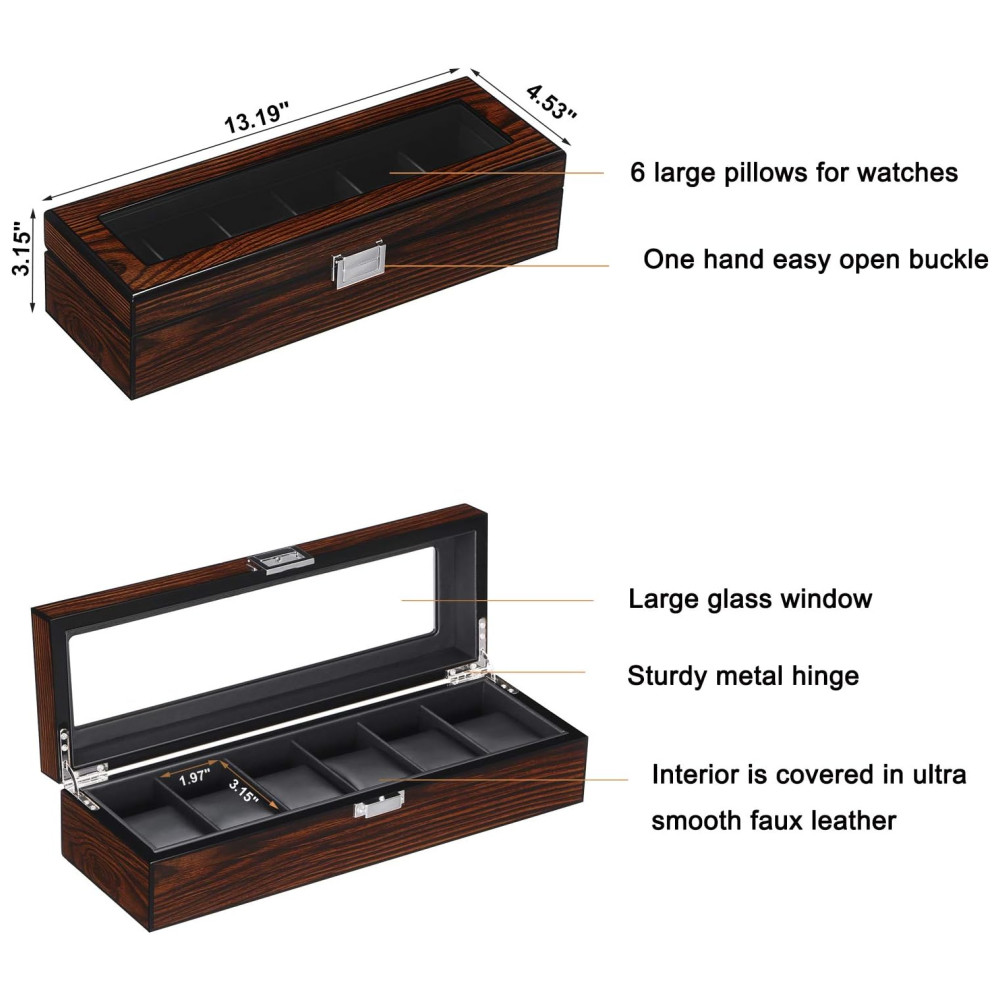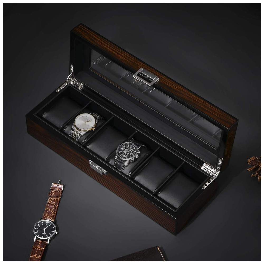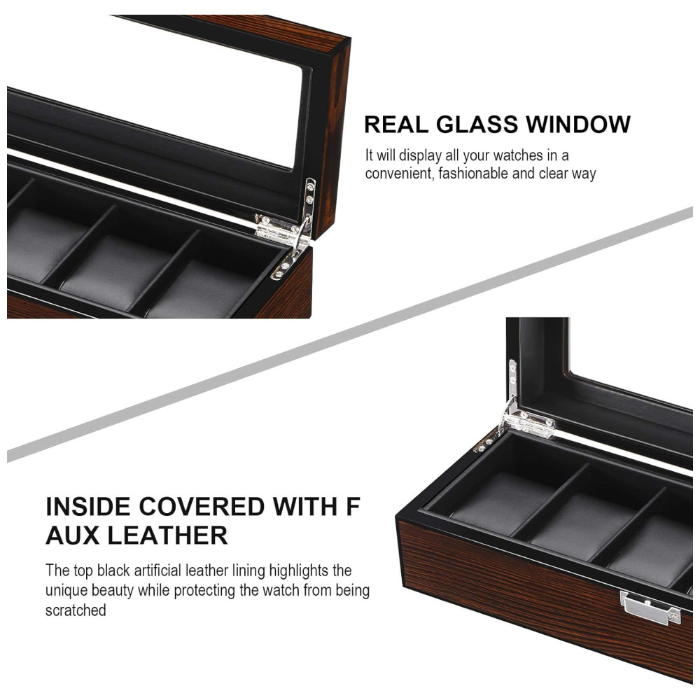 Caixa Estojo de Couro e Visor de Vidro para Relógios com 6 Compartimentos BEWISHOME SSH06Y Marrom
