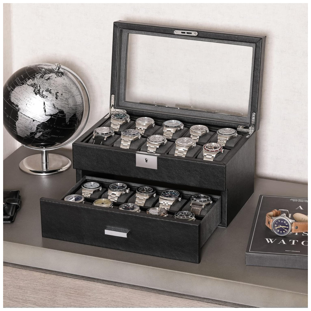 20 SLOTS Com vinte 20 porta relógios, nossa caixa de vidro oferece muito espaço para zenar toda a sua coleção de relógios. Nosso organizador de porta relógios parece simplesmente fantástico enquanto atua como um lindo e deslumbrante estojo de zenamento.