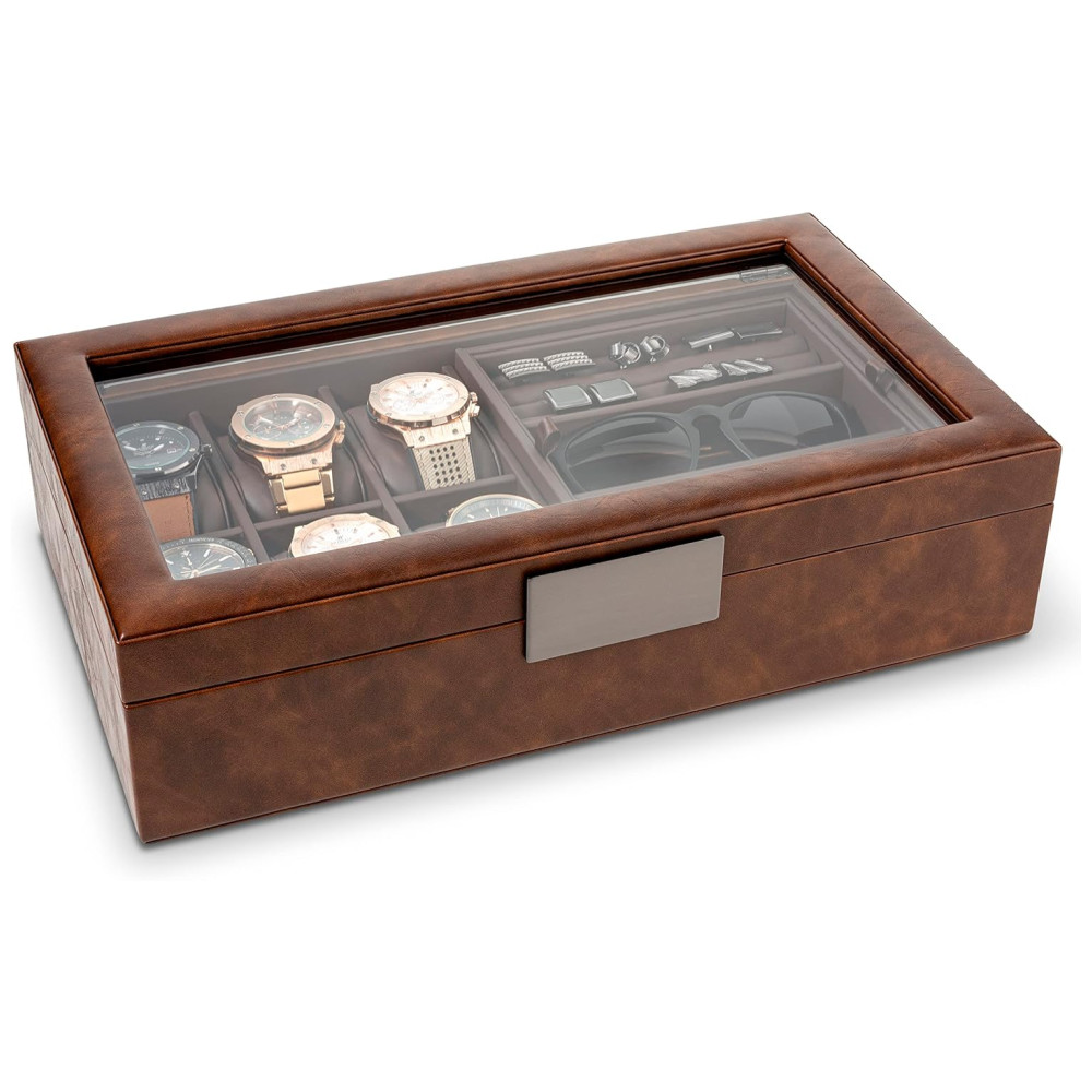 Estojo para relógio masculino, Organizador de fibra de carbono com detalhes em metal, couro PU e tampa de vidro grande, marrom