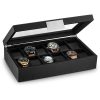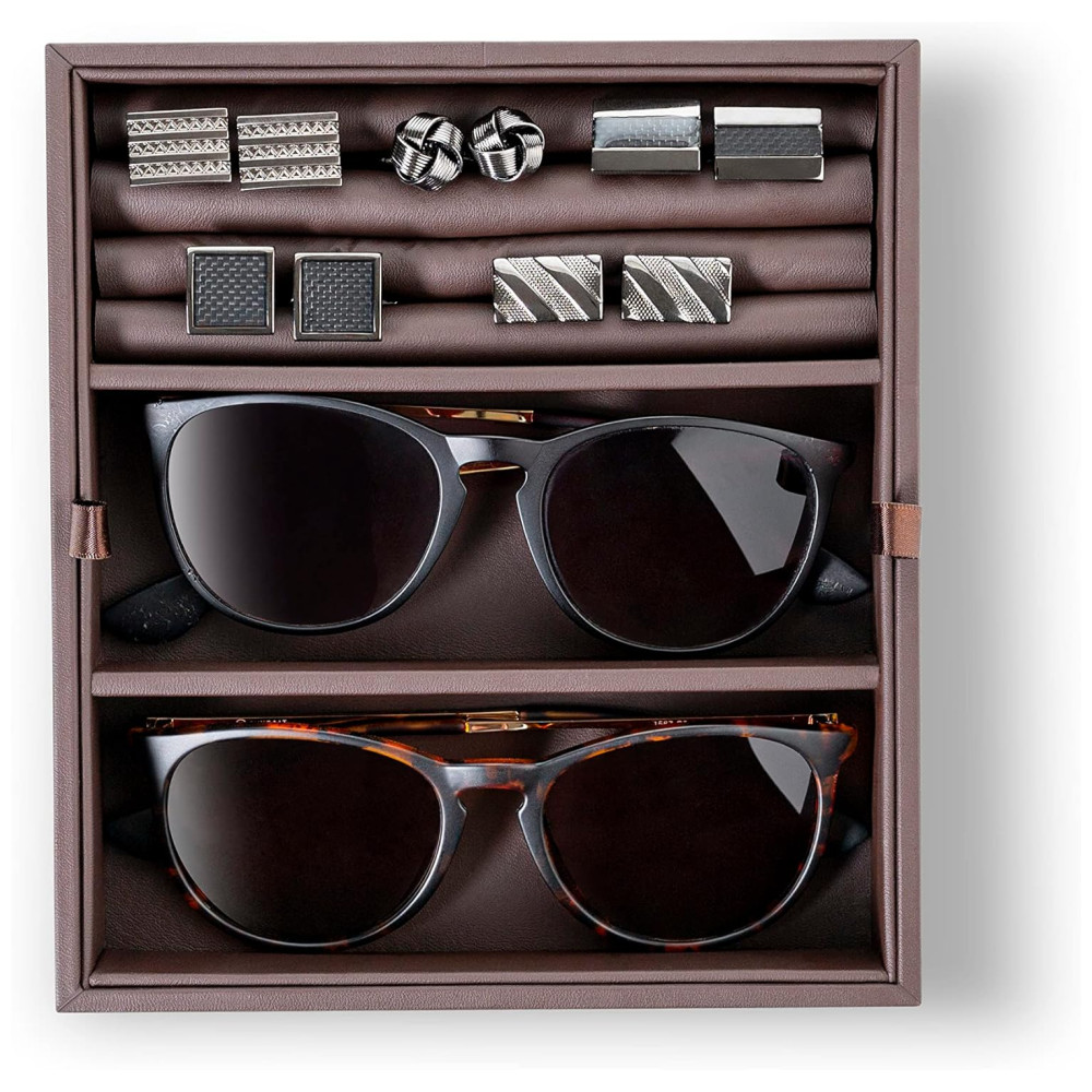 Comporta 6 relógios, 12 abotoaduras, 2 óculos de sol e bandeja de zenamento.