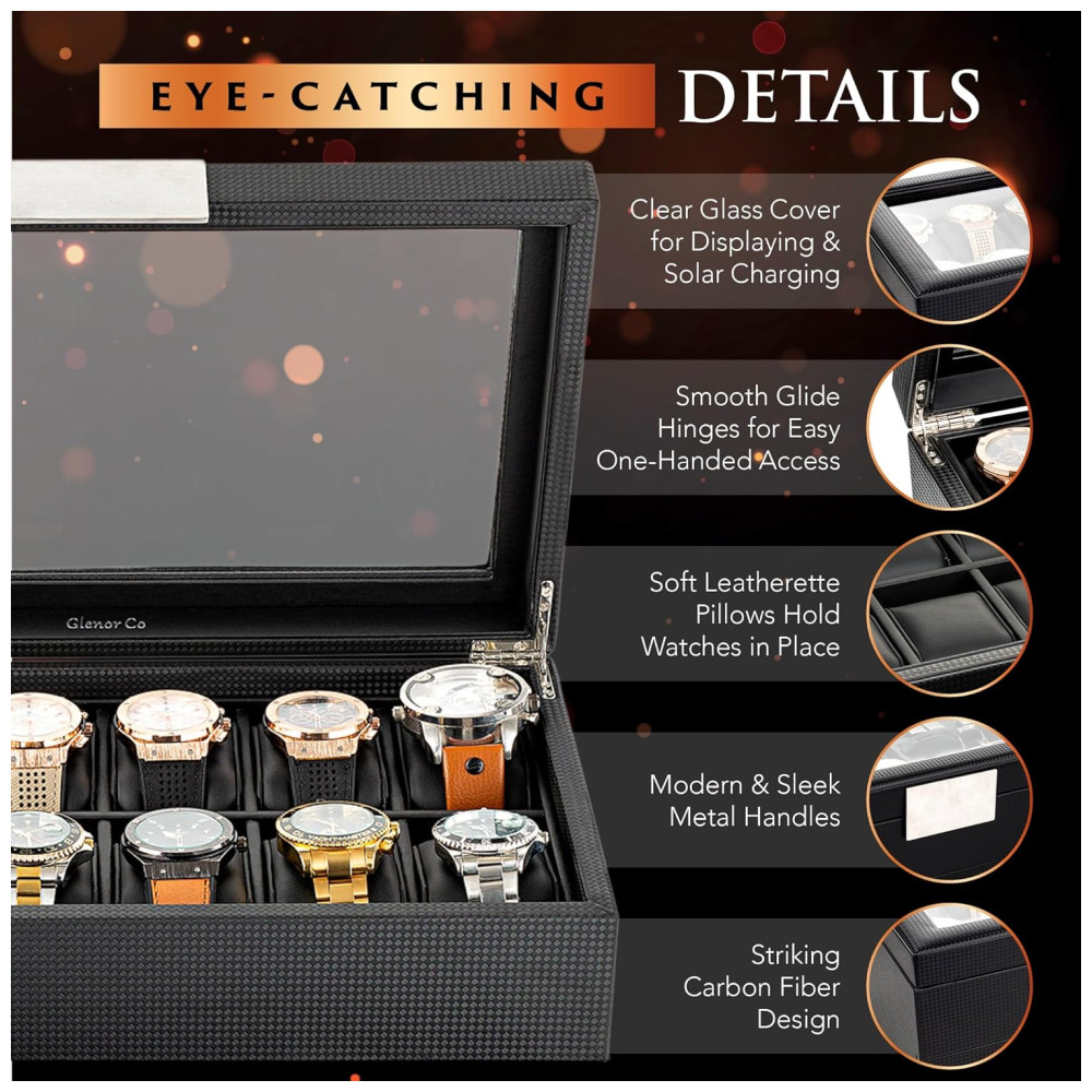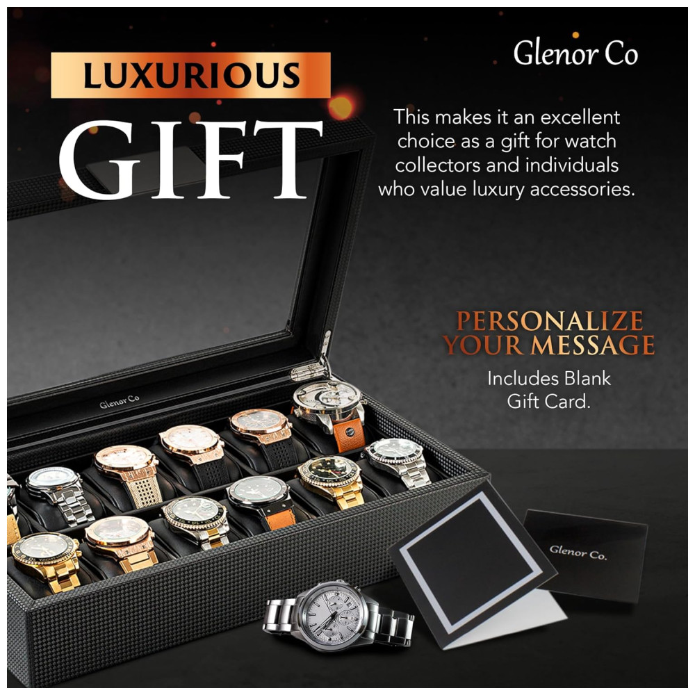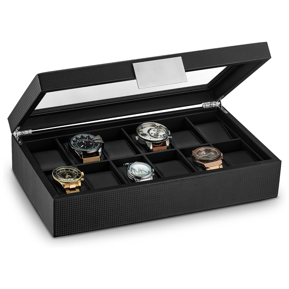 Caixa Estojo de Fibra de Carbono e Visor de Vidro para Relógios com 12 Compartimentos Glenor Co Preto
