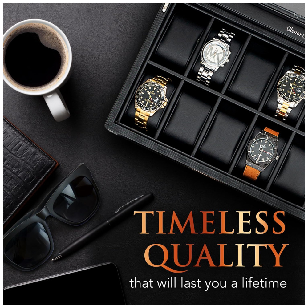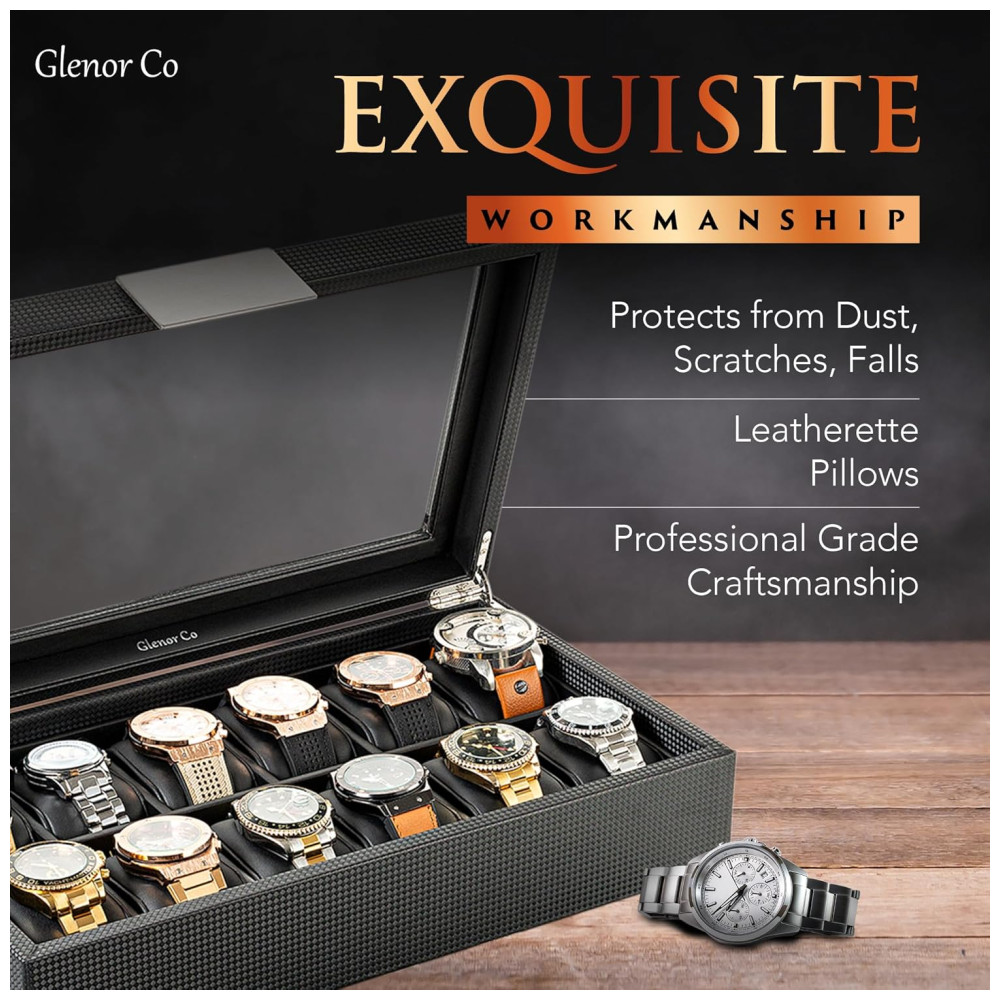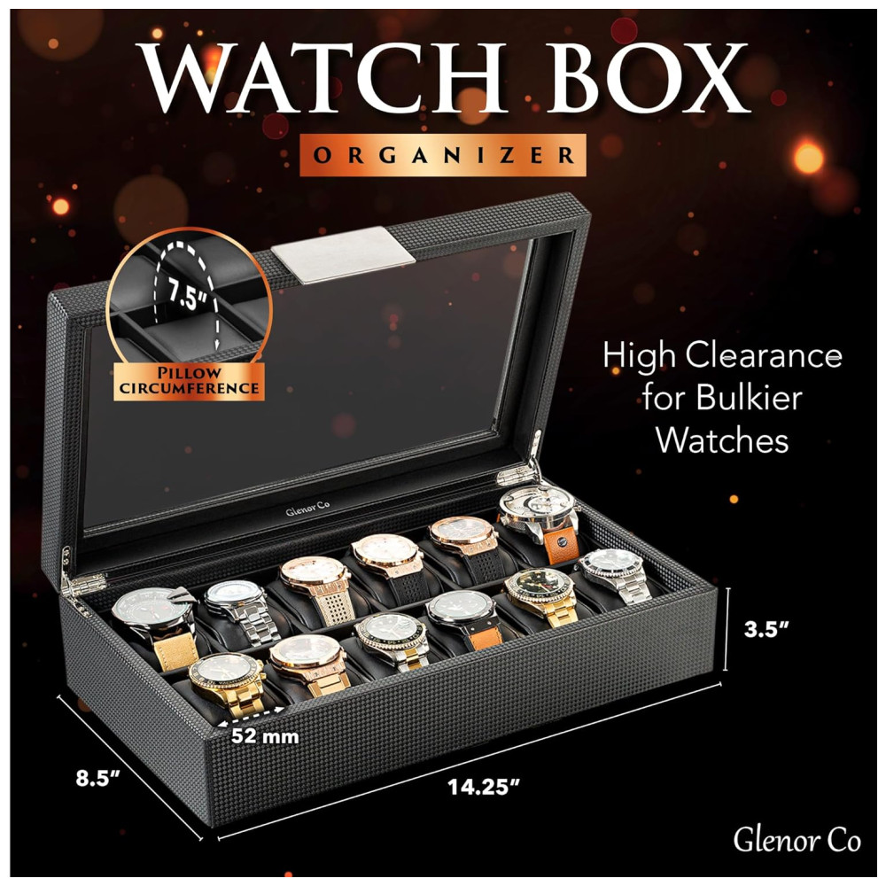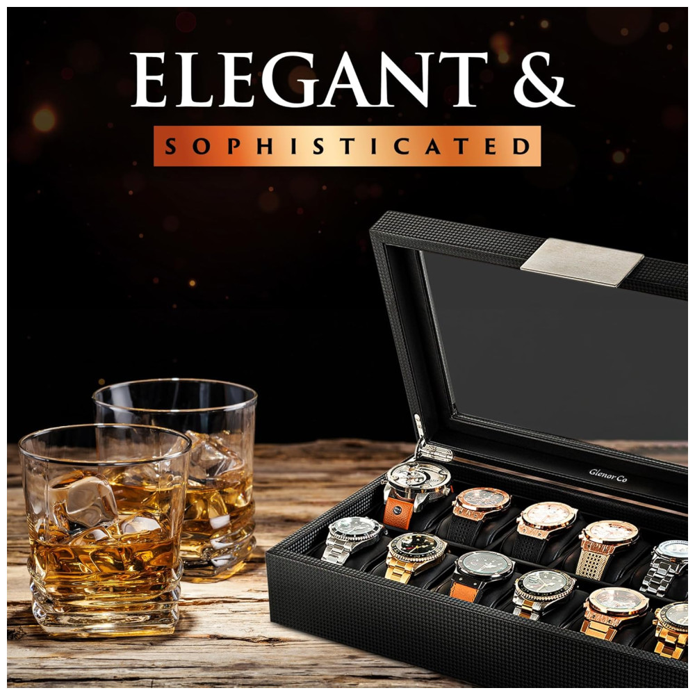 Vai segurar seus relógios grandes e pequenos. Os compartimentos desta caixa de relógio masculino com 12 compartimentos têm de largura e uma folga alta para acomodar seus relógios grandes e volumosos. As almofadas são macias e podem ser espremidas para acomodar relógios menores também. Proteja seus relógios Mantenha todos os seus relógios lindamente exibidos e protegidos contra poeira, arranhões, quedas ou extravios nesta elegante vitrine para homens. É fácil de abrir e fechar, então escolher seu relógio todas as manhãs será muito fácil. Aprovado para profissionais Este organizador de relógios é uma função de artesanato de nível profissional. Suas paredes grossas, dobradiças embutidas lisas e robustas, tampa de vidro real, almofadas de couro sintético de alta qualidade e bordas com acabamento limpo são as qualidades que você procura se levar a sério sua coleção de relógios. Você pode contar com esta caixa para atendê lo por muitos anos maravilhosos. Masculino moderno Ao contrário de outras caixas de relógio para homens, estas caixas de relógio patenteadas de design da Glenor Co, com sua textura de fibra de carbono, detalhes em metal duro e construção atraente e limpa, foram cuidadosamente trabalhadas com o homem sofisticado em mente. Glenor Co Promise A Glenor Co está por trás de seus produtos e garantirá que você aproveite sua vitrine de relógio por muitos anos. Se você tiver algum problema com sua caixa, cuidaremos de você e garantiremos que você seja um cliente feliz. Então peça sua caixa sem preocupações. DIMENSÕES Exterior 14 polegadas de comprimento x 8 polegadas de largura x 3 polegadas de altura. Compartimentos internos 2 polegadas de largura x 3 polegadas de comprimento