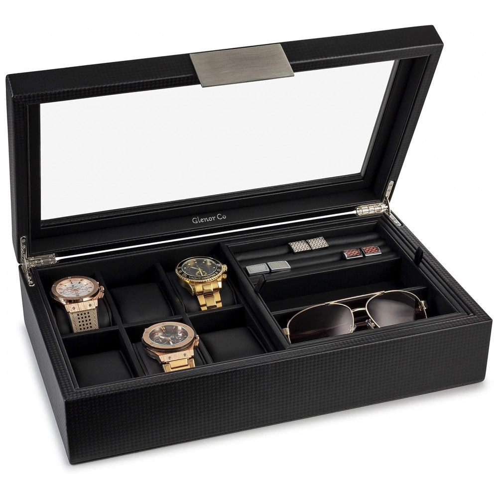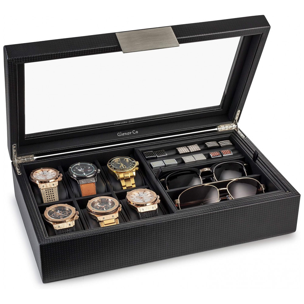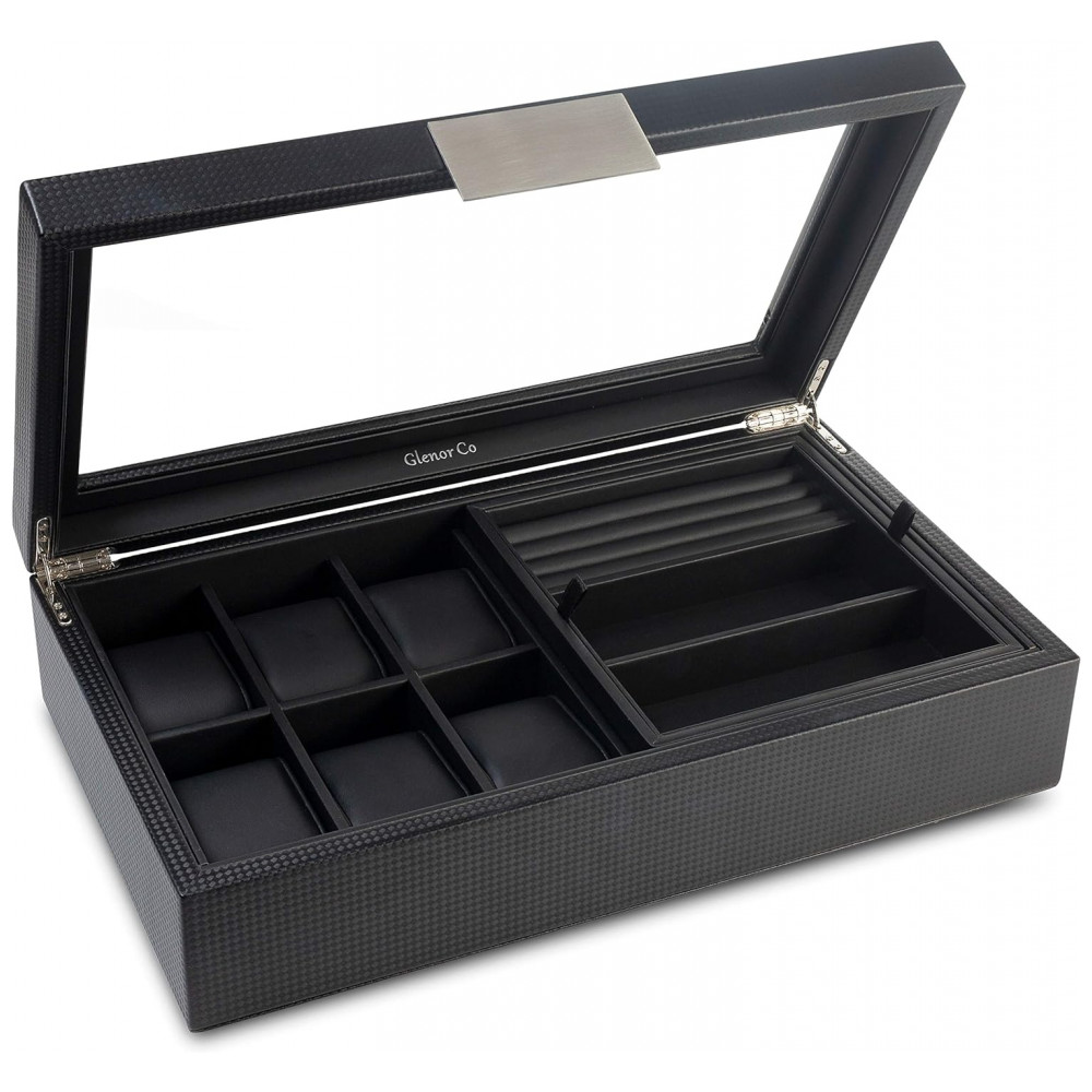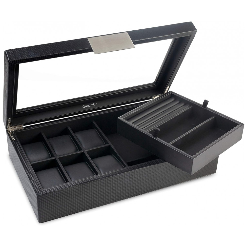 Caixa Estojo de Fibra de Carbono e Visor de Vidro para Relógios com 6 Compartimentos Glenor Co Preto