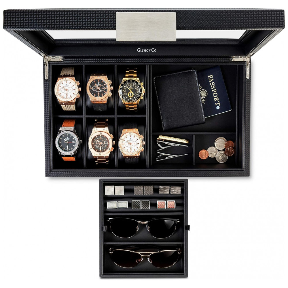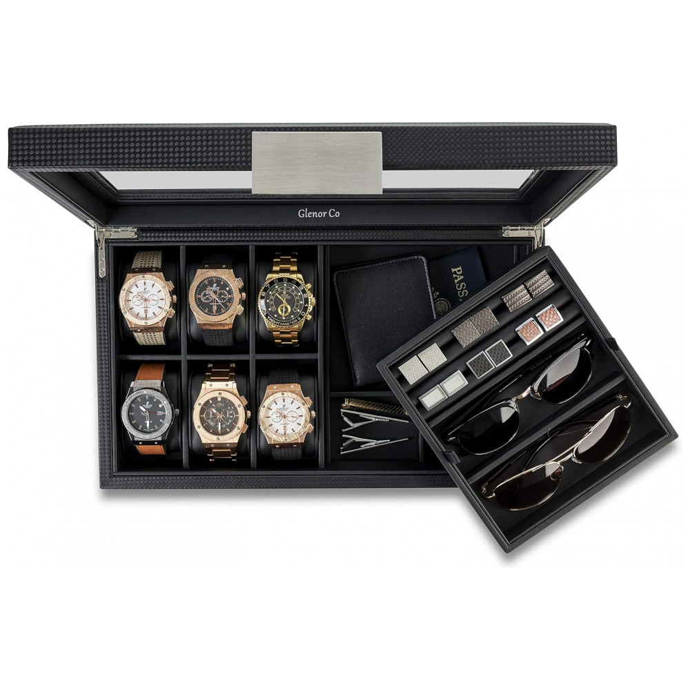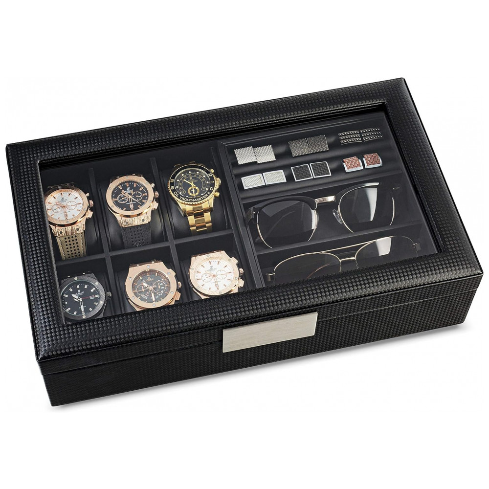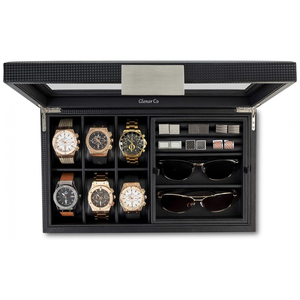 Caixa Estojo de Fibra de Carbono e Visor de Vidro para Relógios com 6 Compartimentos Glenor Co Preto