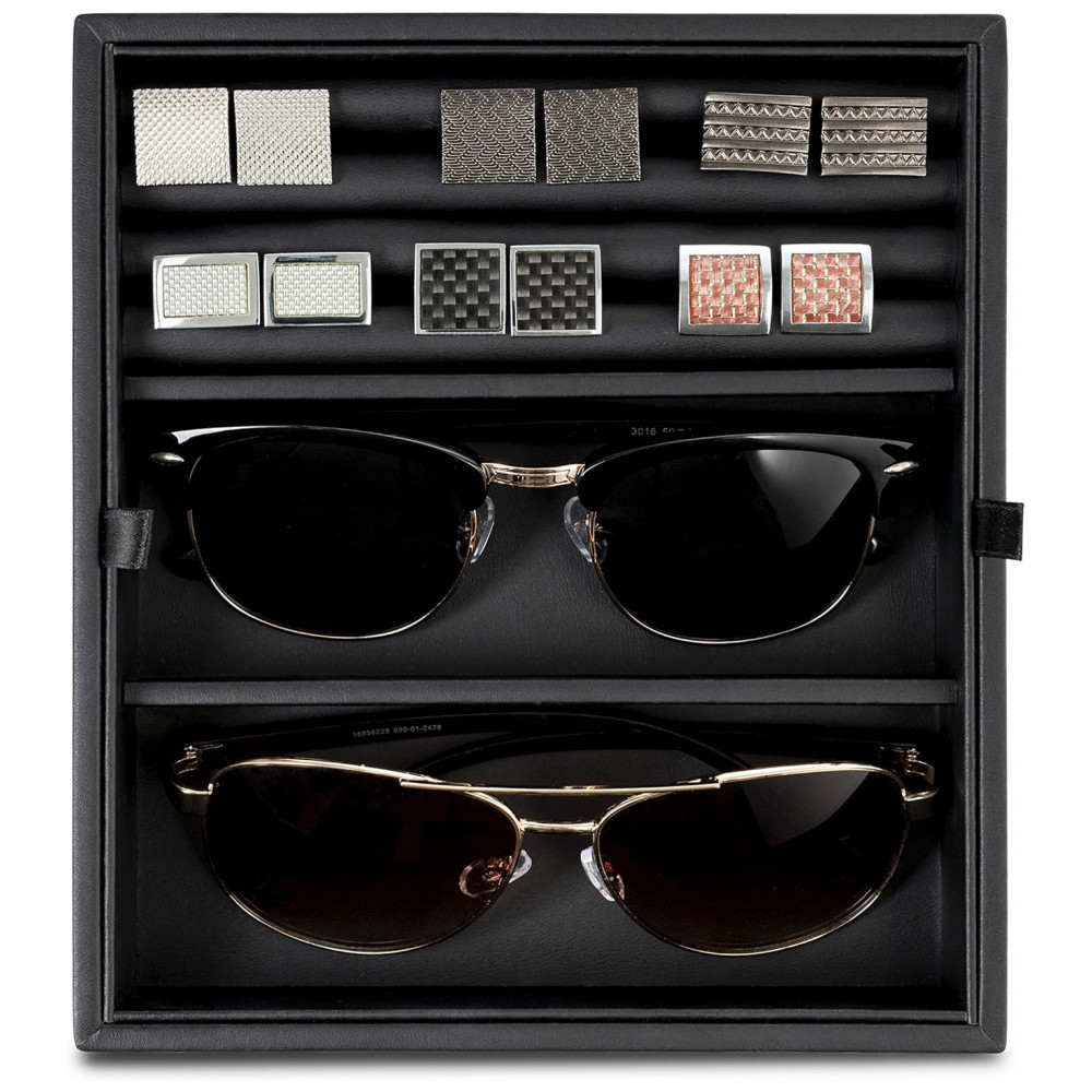 MANTENHA SE ORGANIZADO Mantenha seus relógios, abotoaduras, óculos de sol e outros objetos de valor organizados, tudo em um só lugar e em um piscar de olhos. Esta caixa grande tem compartimentos e almofadas para guardar 6 relógios grandes, 12 abotoaduras, 2 óculos de sol e 3 compartimentos ocultos para outros objetos de valor. Economize tempo crítico e transforme suas frenéticas manhãs frustradas em uma brisa.