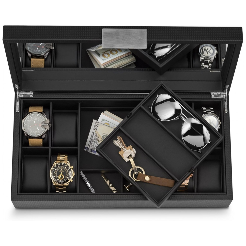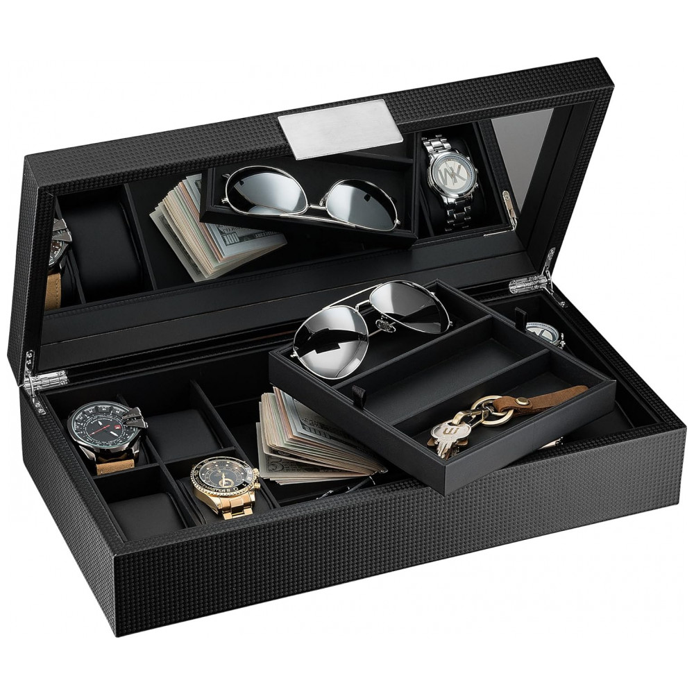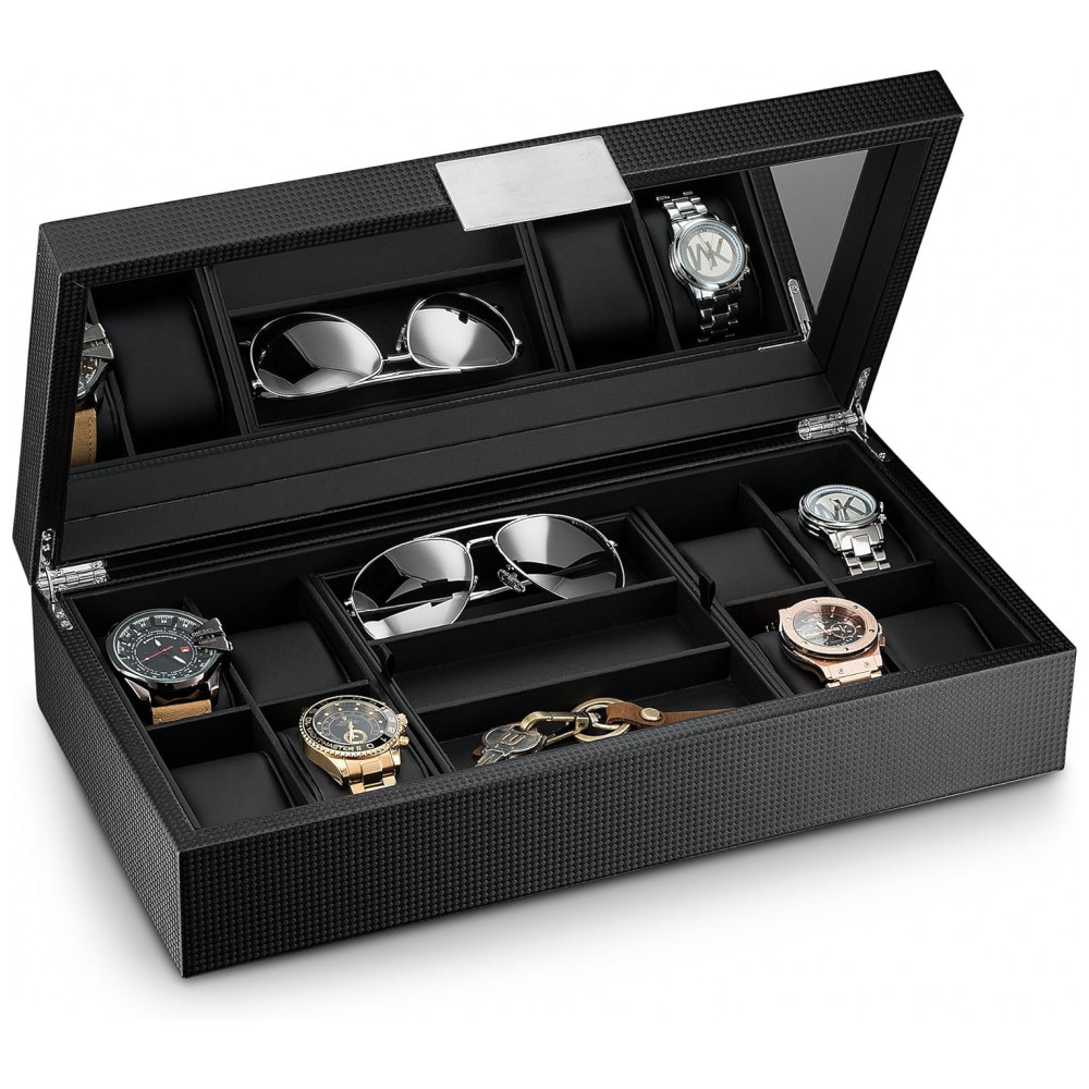 MANTENHA SE ORGANIZADO Mantenha seus relógios, óculos de sol e outros objetos de valor organizados, tudo em um só lugar e em um piscar de olhos. Esta caixa grande tem compartimentos e almofadas para guardar 8 relógios grandes, 3 óculos de sol e 3 compartimentos ocultos para outros objetos de valor. Economize tempo crítico e transforme suas frenéticas manhãs frustradas em uma brisa.
