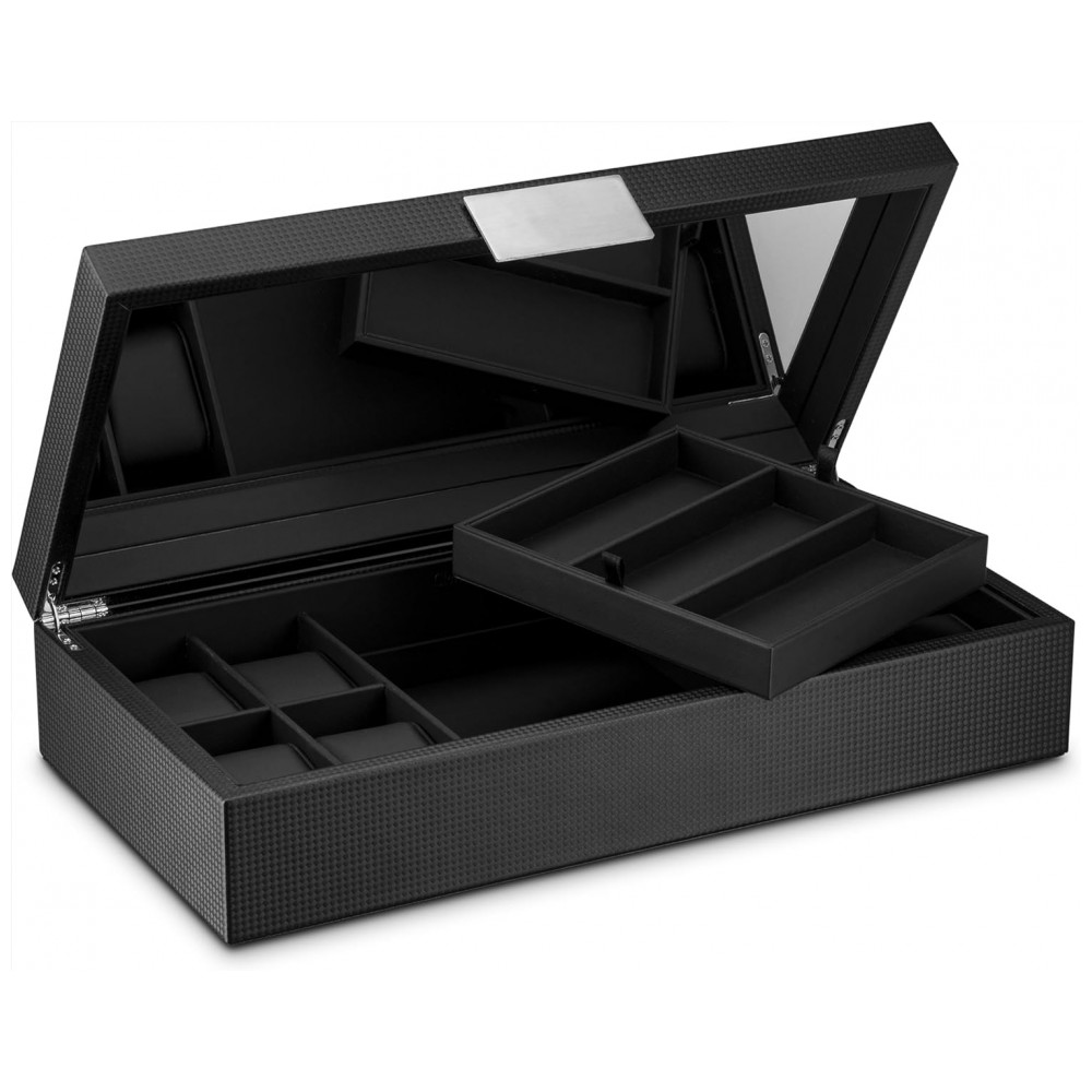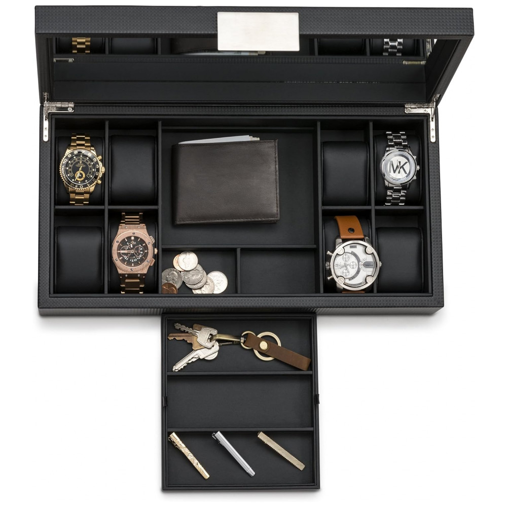 Caixa Estojo de Fibra de Carbono para Relógios com 14 Compartimentos Glenor Co Preto