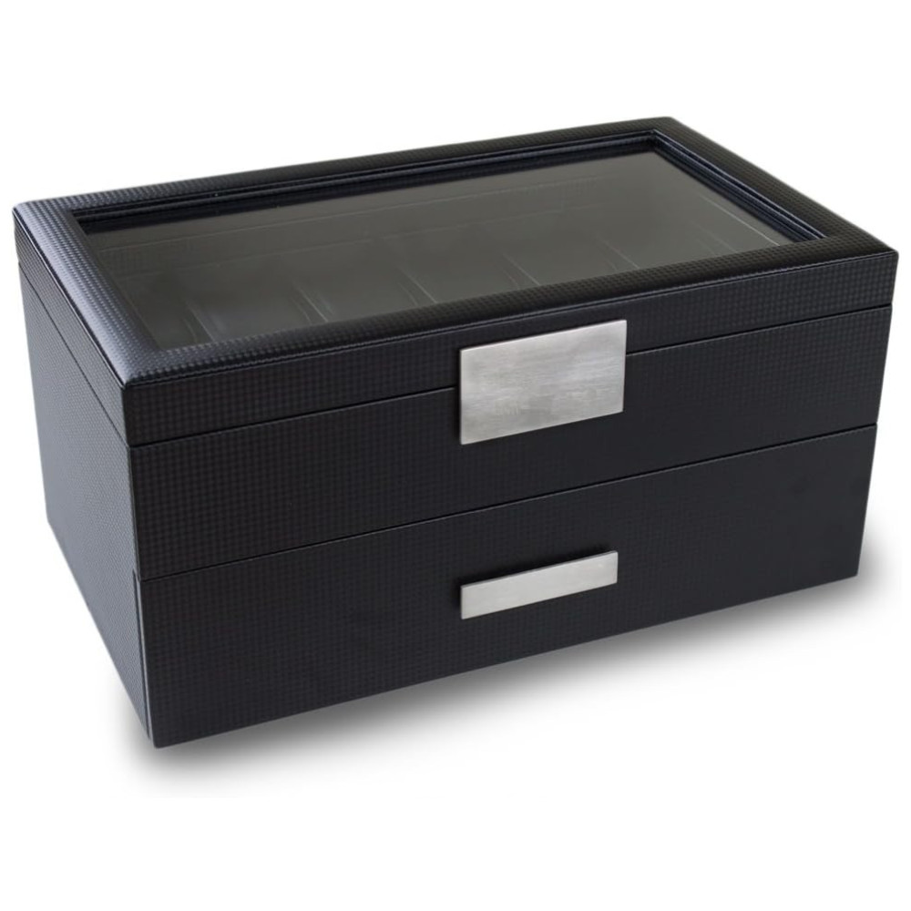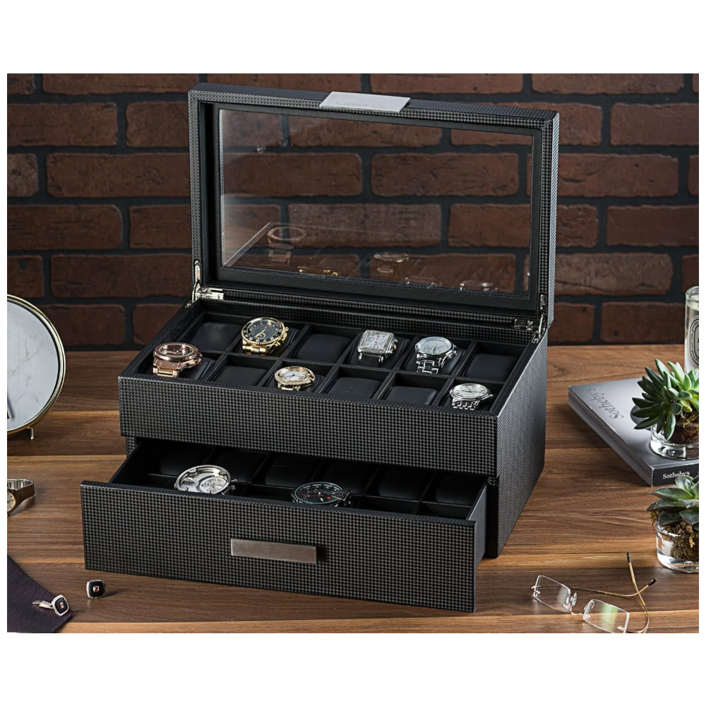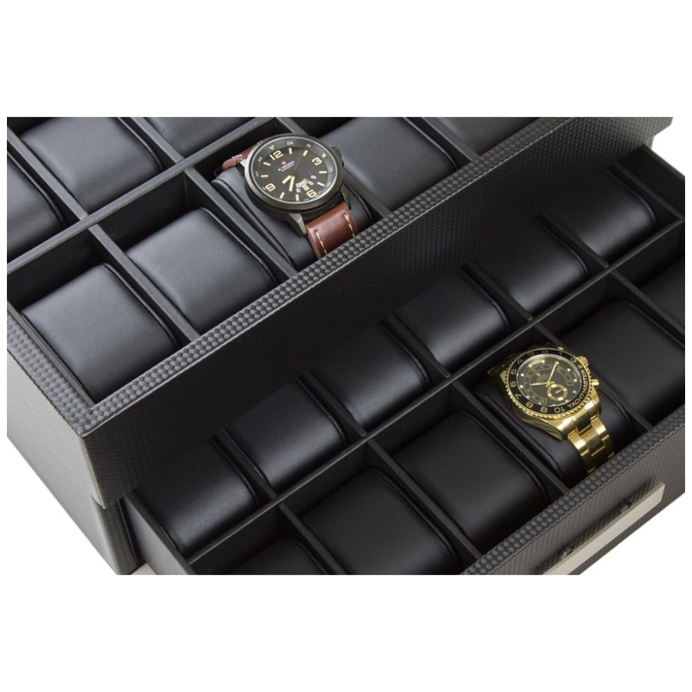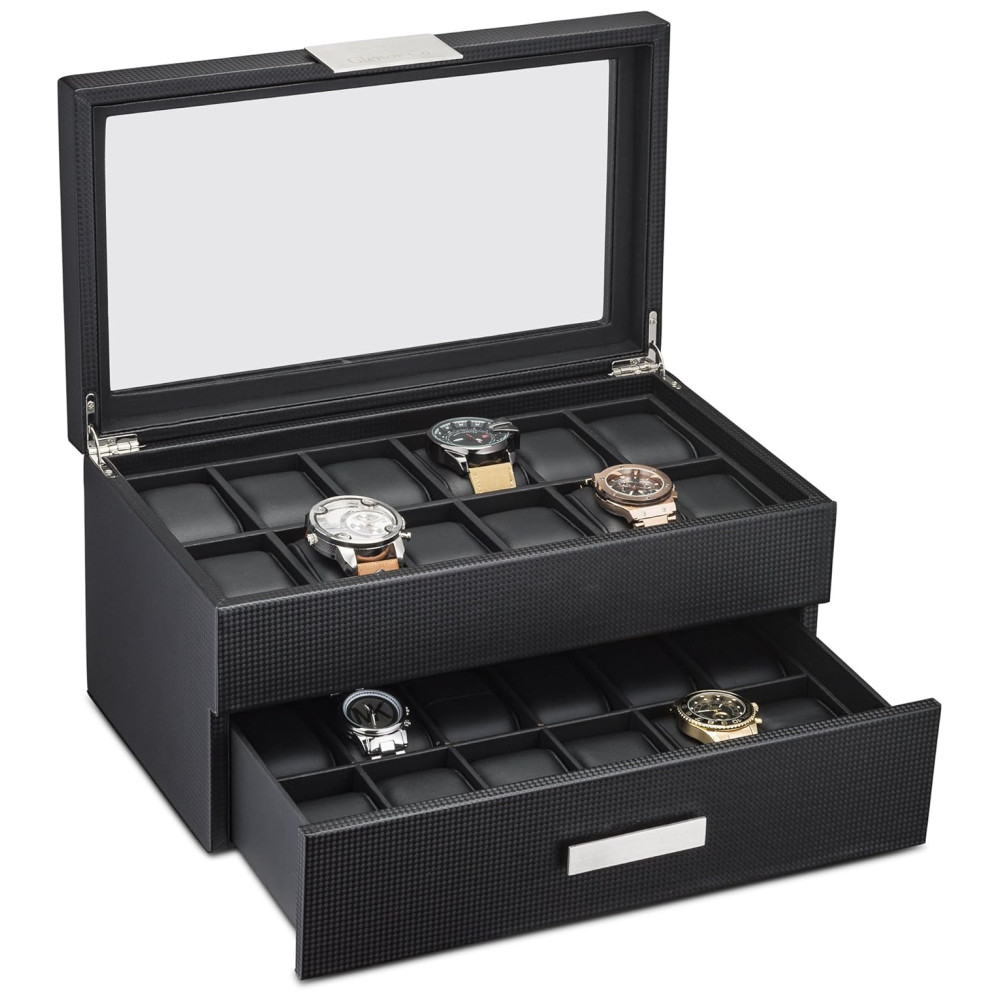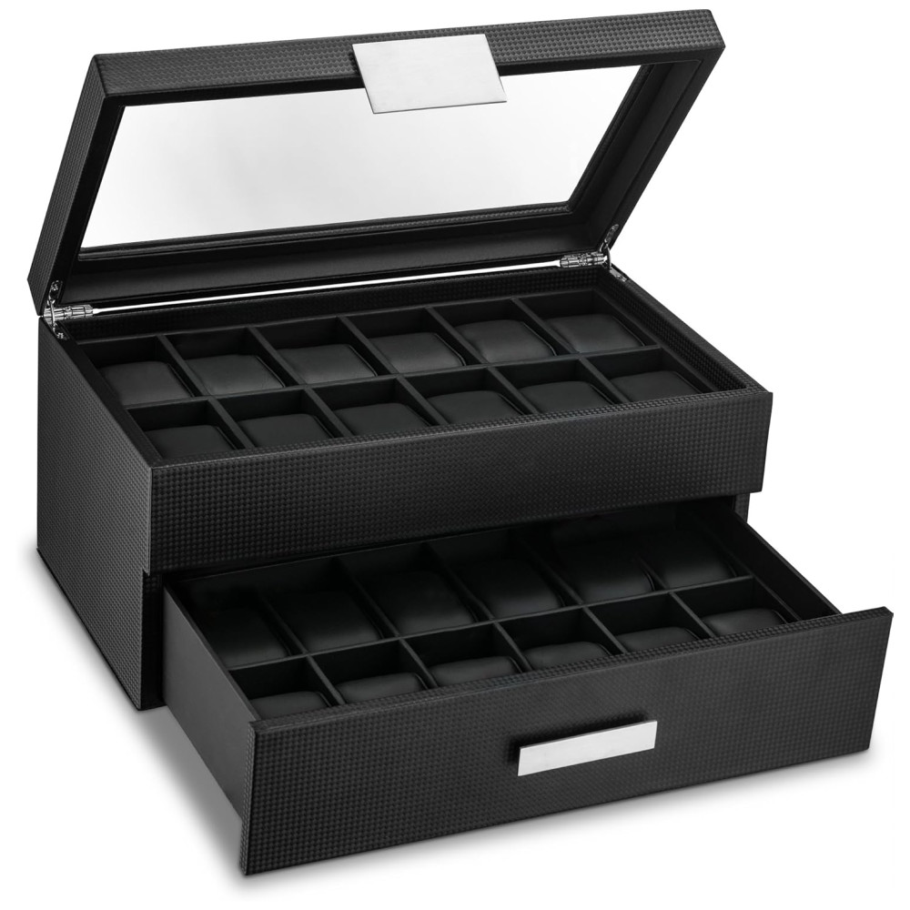 Caixa Estojo de Fibra de Carbono para Relógios com 24 Compartimentos Glenor Co Preto
