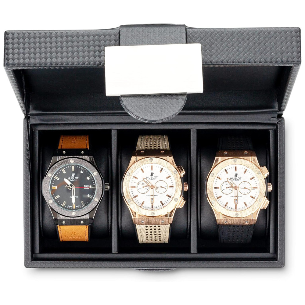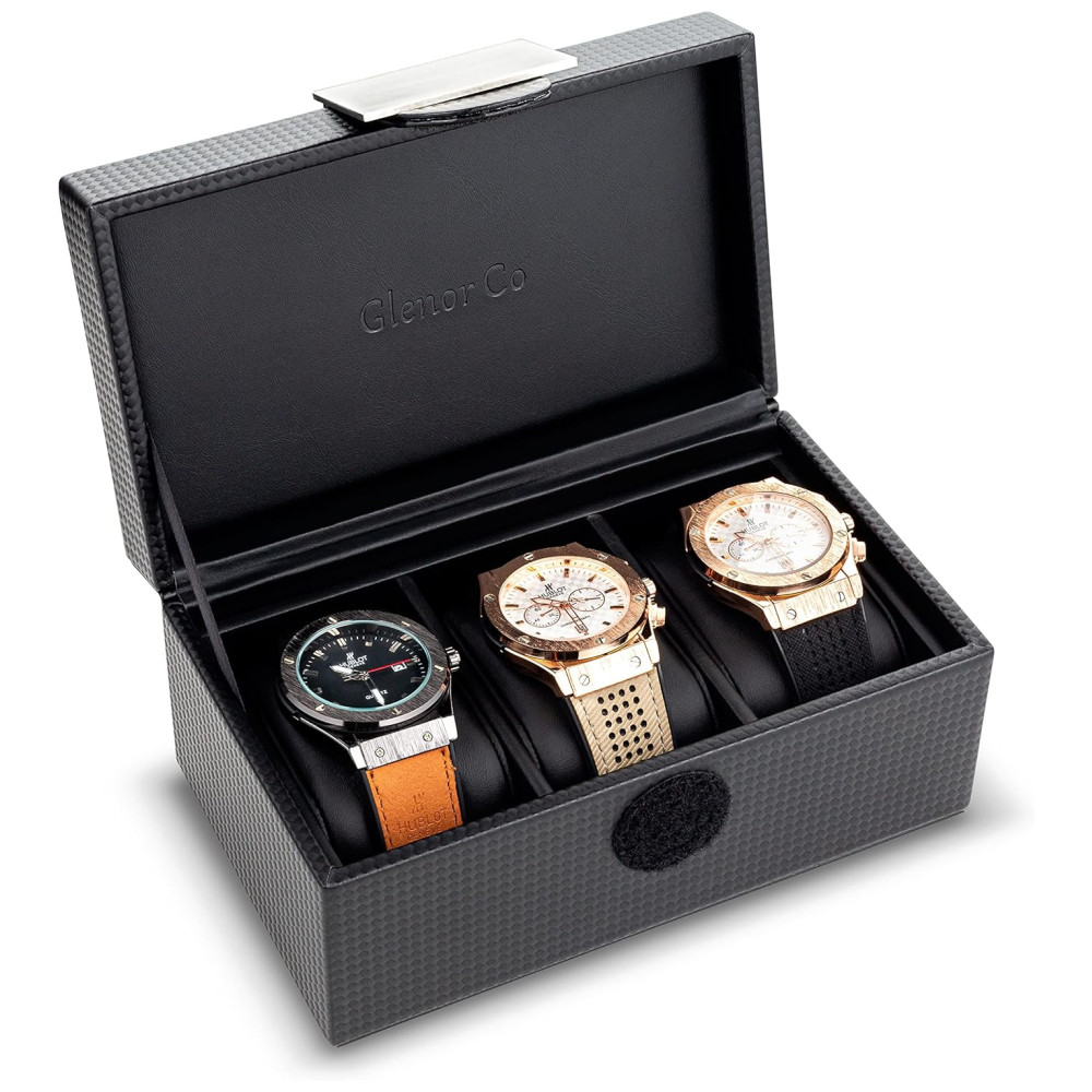 Caixa Estojo de Fibra de Carbono para Relógios com 3 Compartimentos Glenor Co Preto