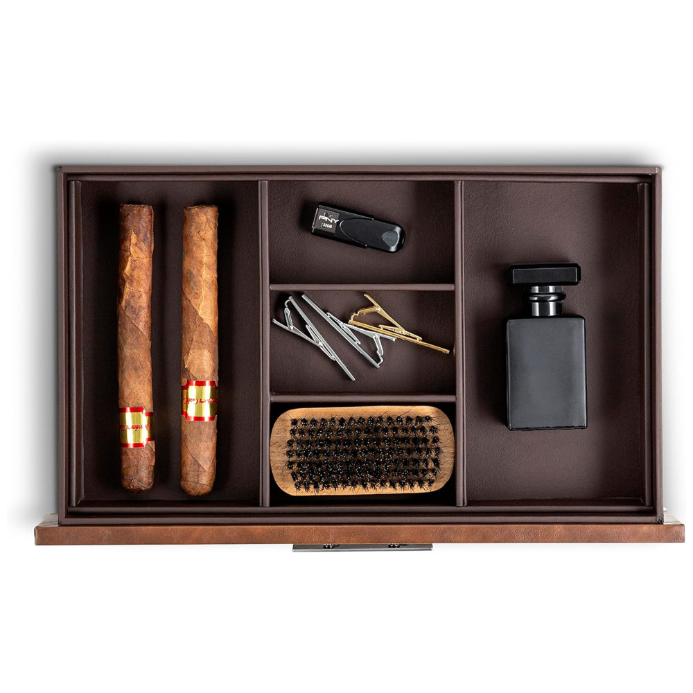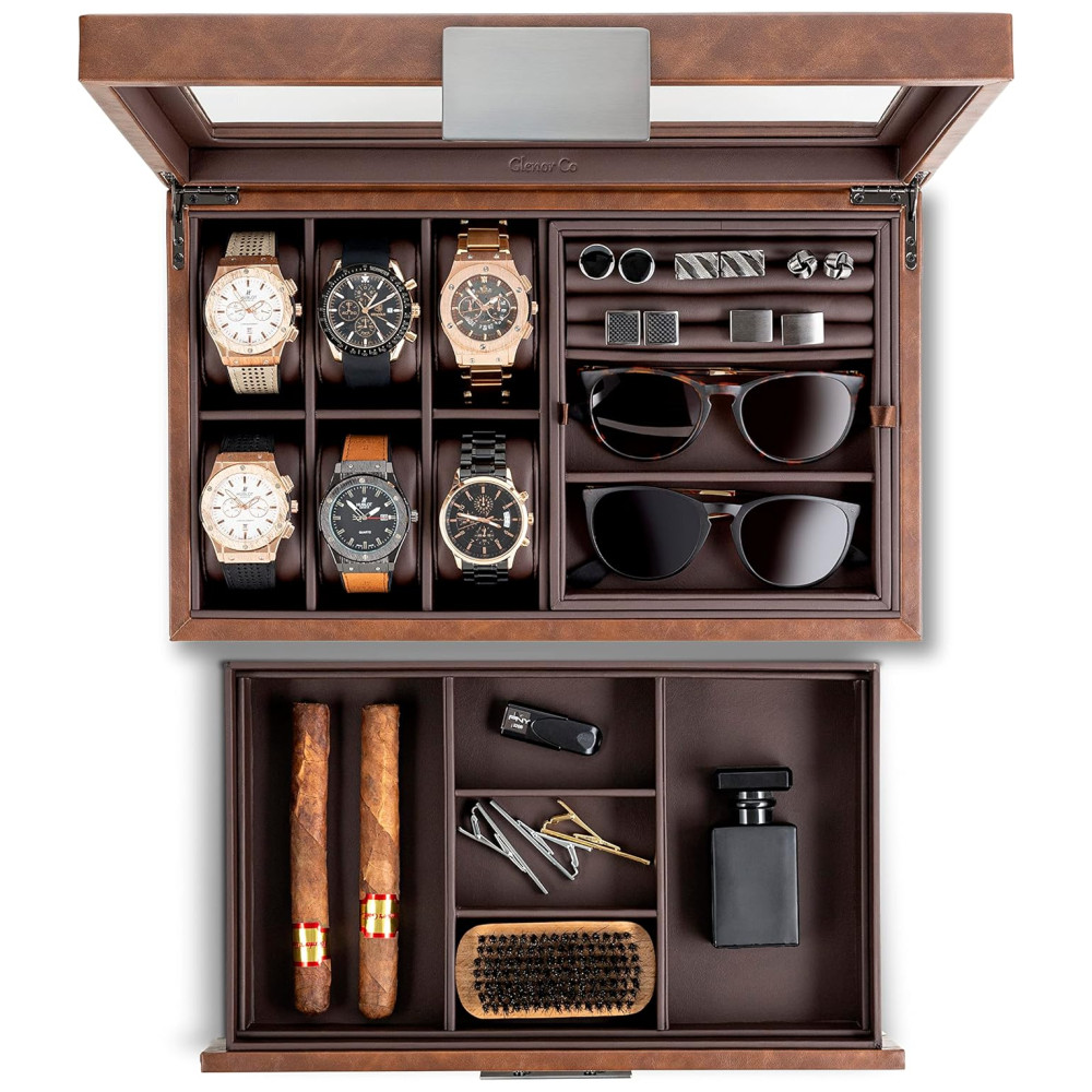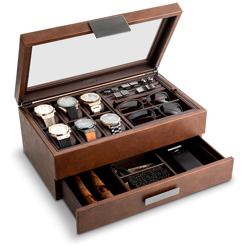MANTENHA SE ORGANIZADO Mantenha seus relógios, abotoaduras, óculos de sol e outros objetos de valor organizados, tudo em um só lugar e em um piscar de olhos. Esta caixa grande tem compartimentos e almofadas para guardar 6 relógios grandes, 12 abotoaduras, 2 óculos de sol e 3 compartimentos ocultos para outros objetos de valor. Economize tempo crítico e transforme suas frenéticas manhãs frustradas em uma brisa. VALET oferece mais espaço para guardar suas abotoaduras, anéis, prendedores de gravata, óculos de sol, canetas, dinheiro, cartões ou ferramentas de relógio