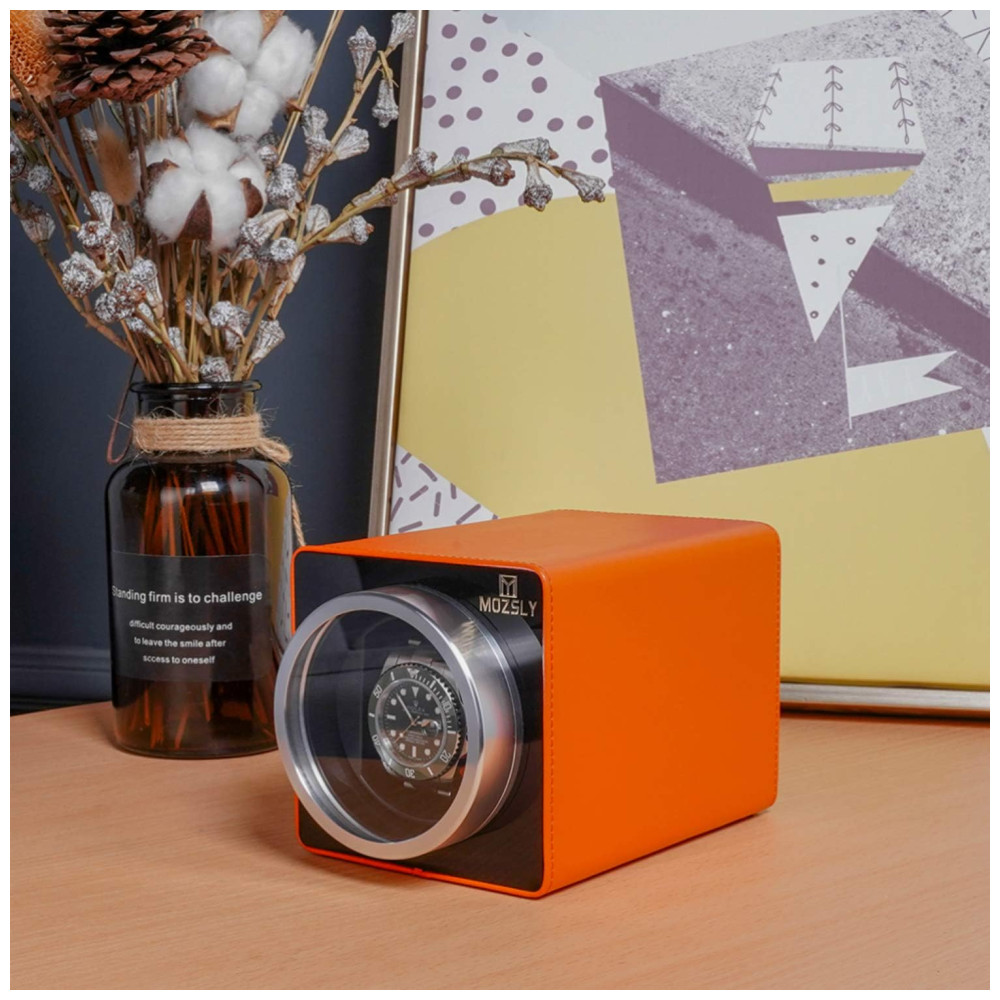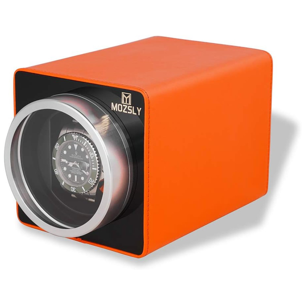 Design de moda Mozsly watch winder selecionado couro PU laranja e vidro acrílico transparente dão a esta caixa de relógio deluxe winder um toque confortável e uma aparência agradável, uma ótima opção de presente.