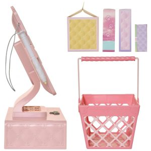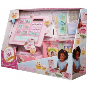 Leve seus itens para a caixa registradora usando o charmoso carrinho de compras e registre os com uma calculadora real e funcional. Passe o cartão de crédito para cobrar e mergulhe a caneta na água para assinar seu nome no bloco de assinatura ativado por água. As compras nunca foram tão chiques e realistas.