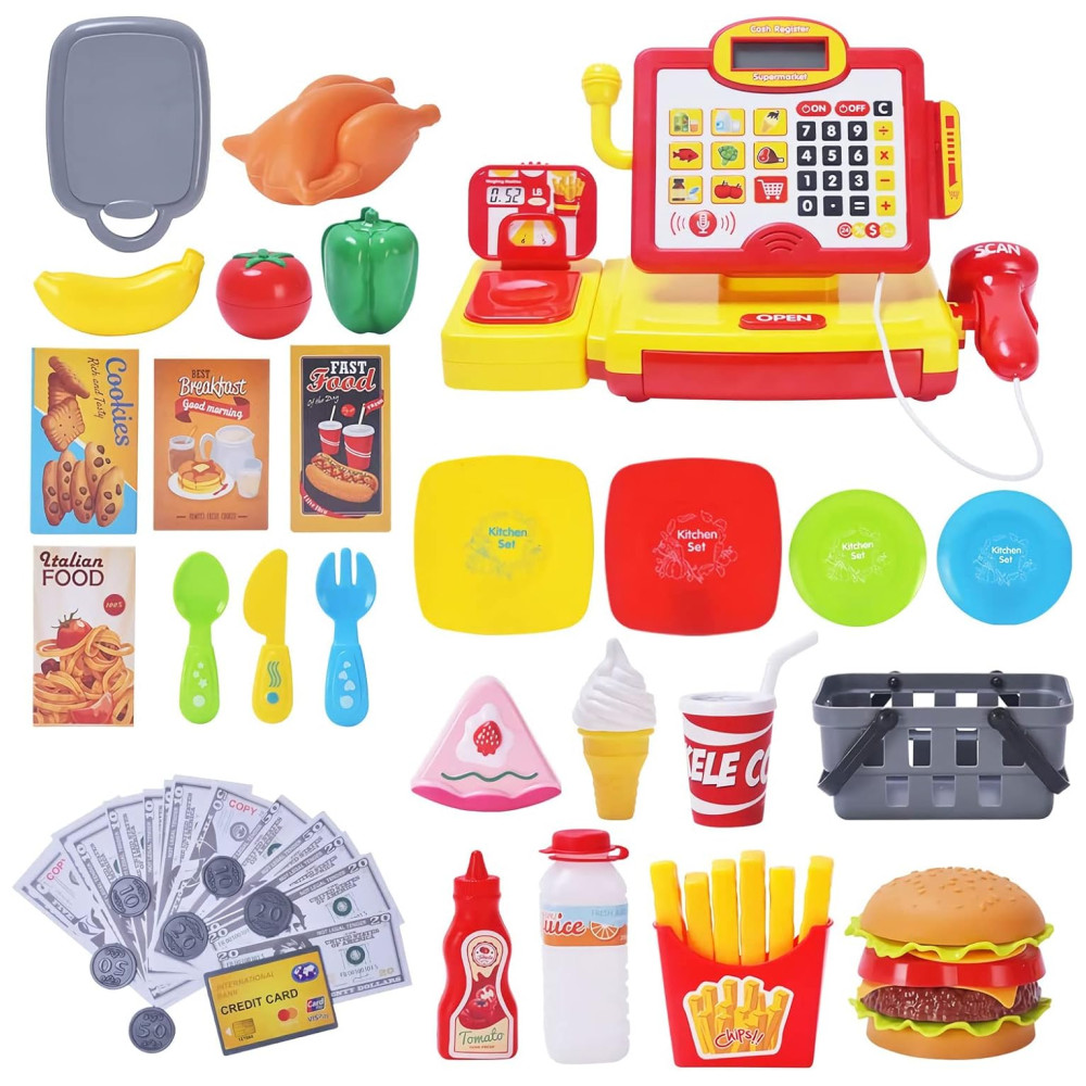 Inclui caixa, scanner simulado, cesta, dinheiro de mentira, cartões, alimentos de brinquedo (vegetais, hambúrgueres), utensílios e pratos.