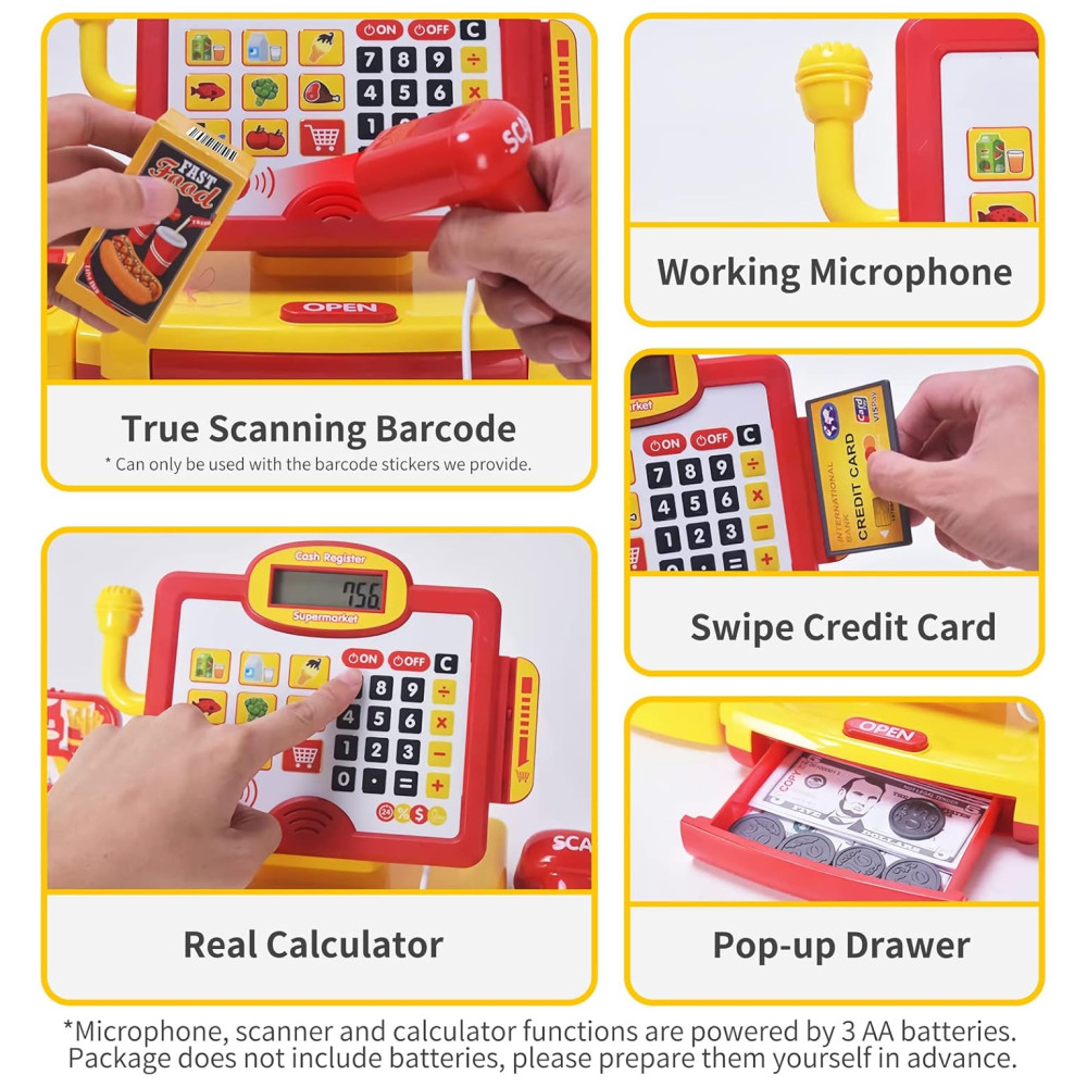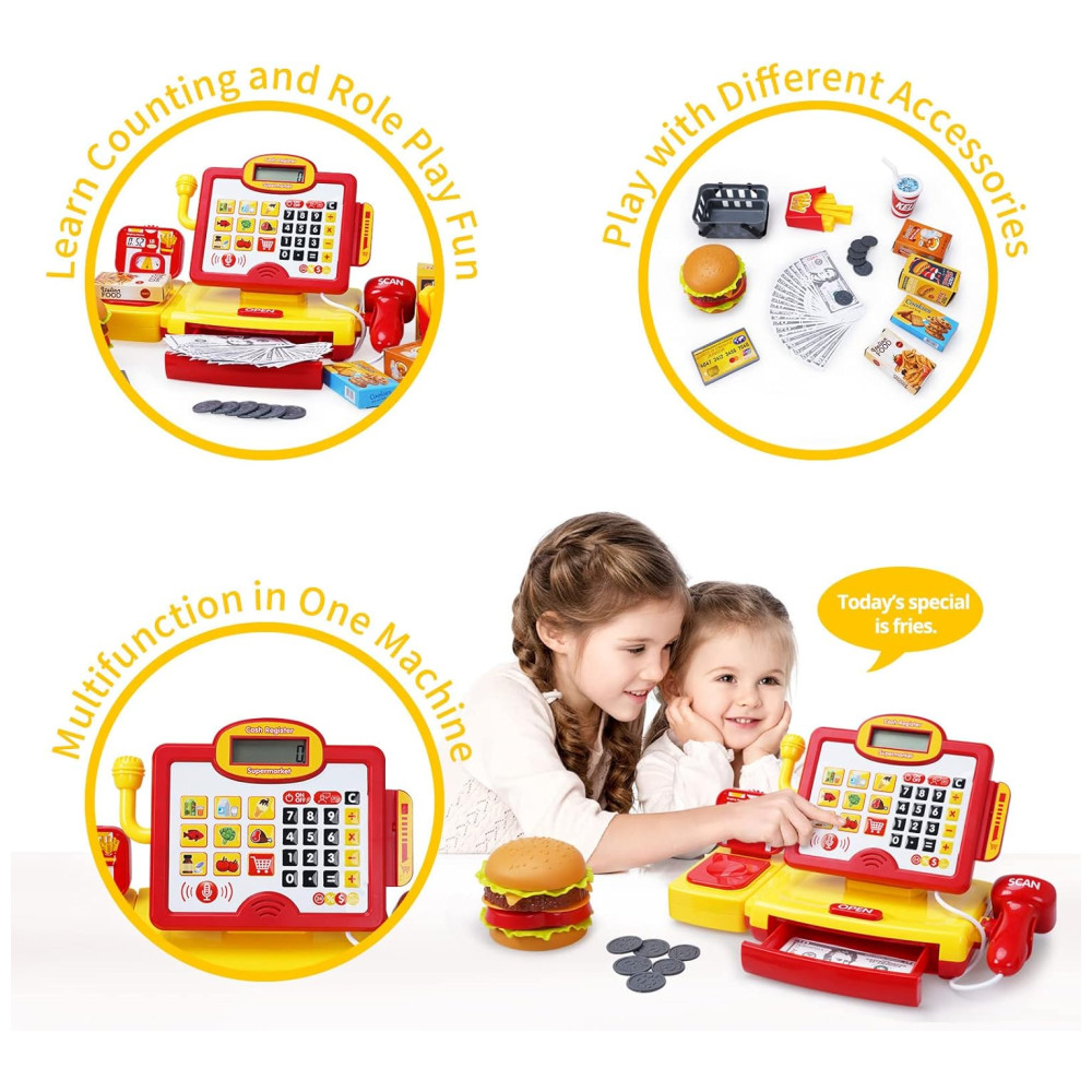 Caixa Registradora Multifuncional com Leitor de Código de Barras, Calculadora, Microfone, Gaveta Pop-Up, Cesta e Acessórios de Comida DIY