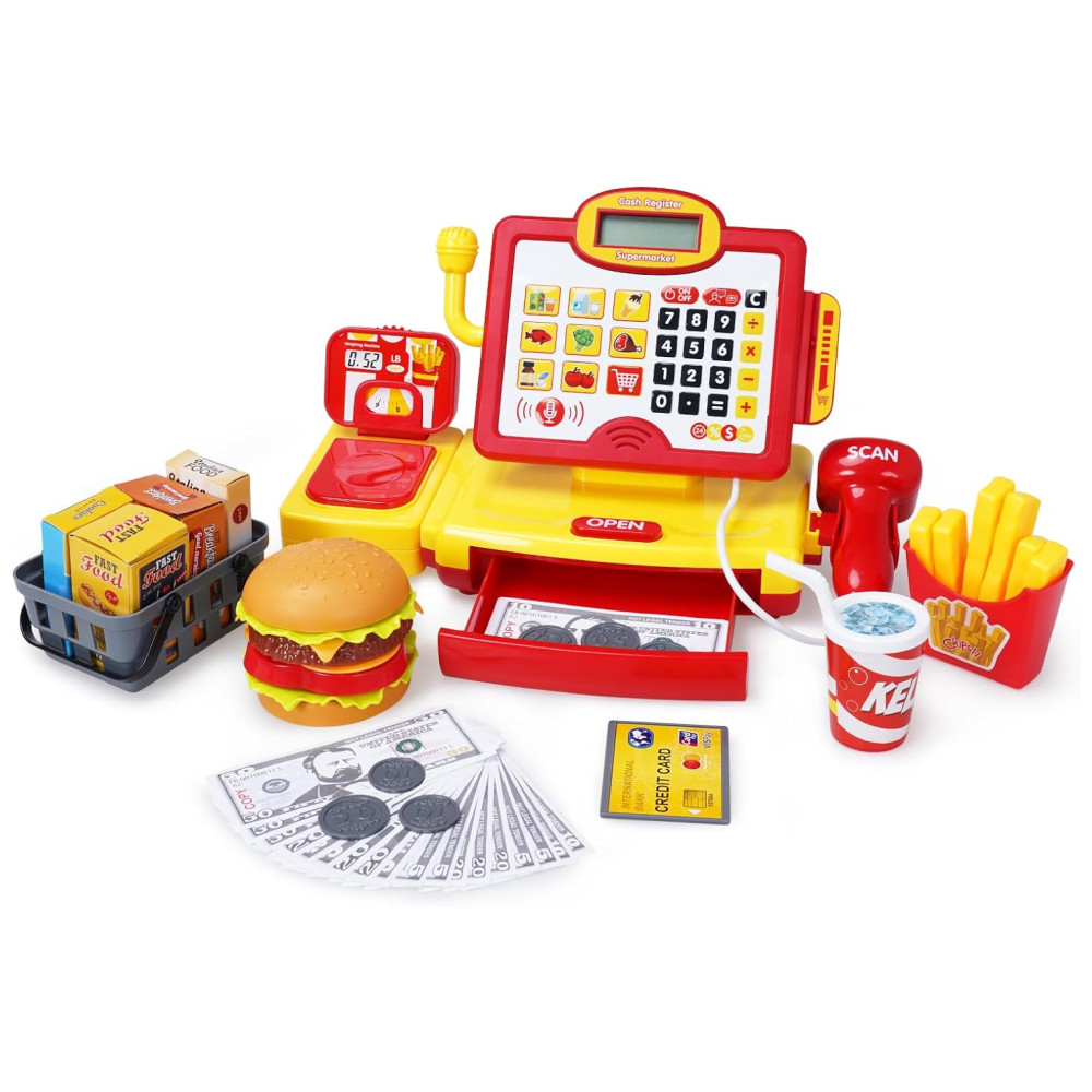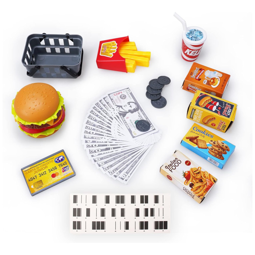 Inclui alimentos simulados, notas, moedas e efeitos sonoros para aprendizado lúdico (3-5 anos).