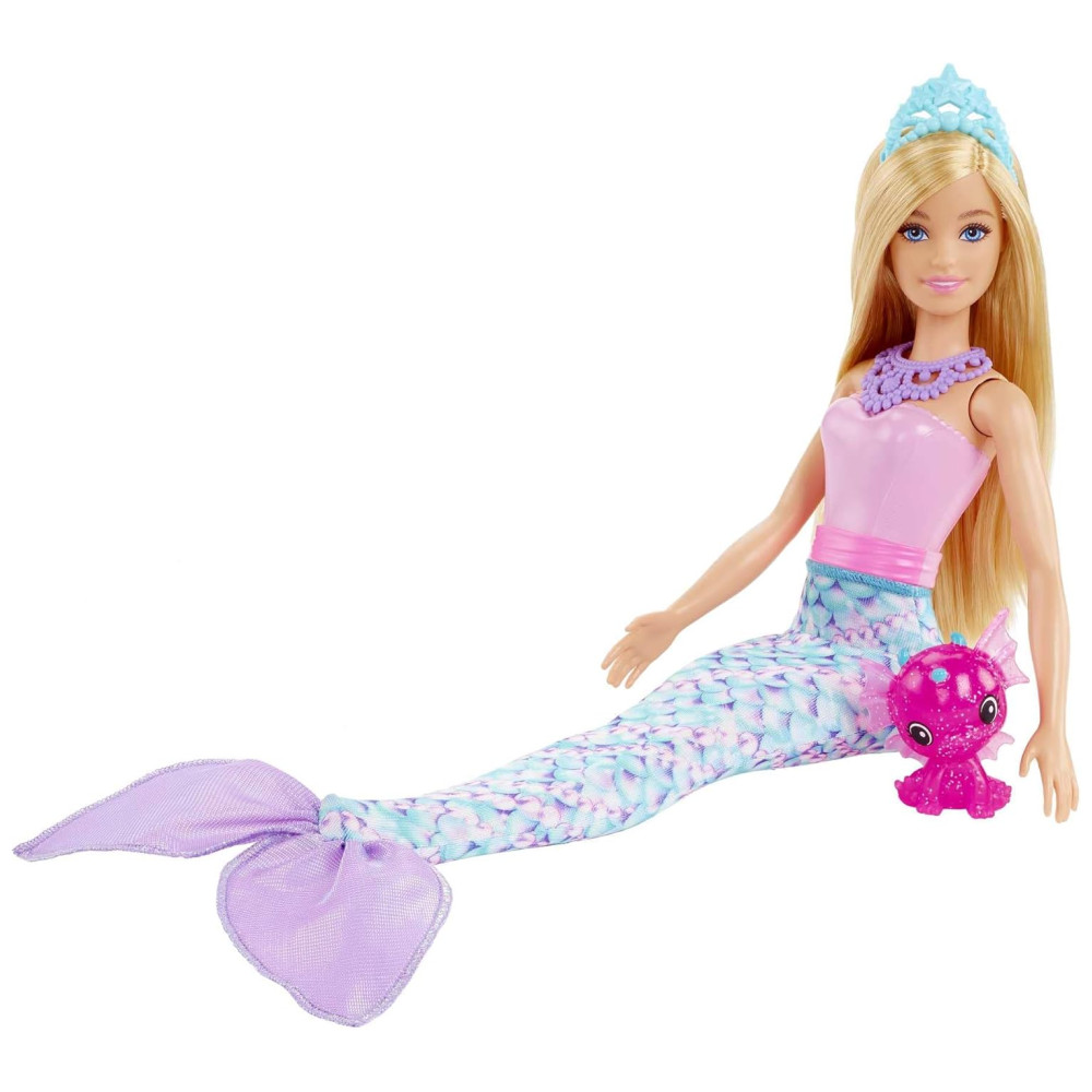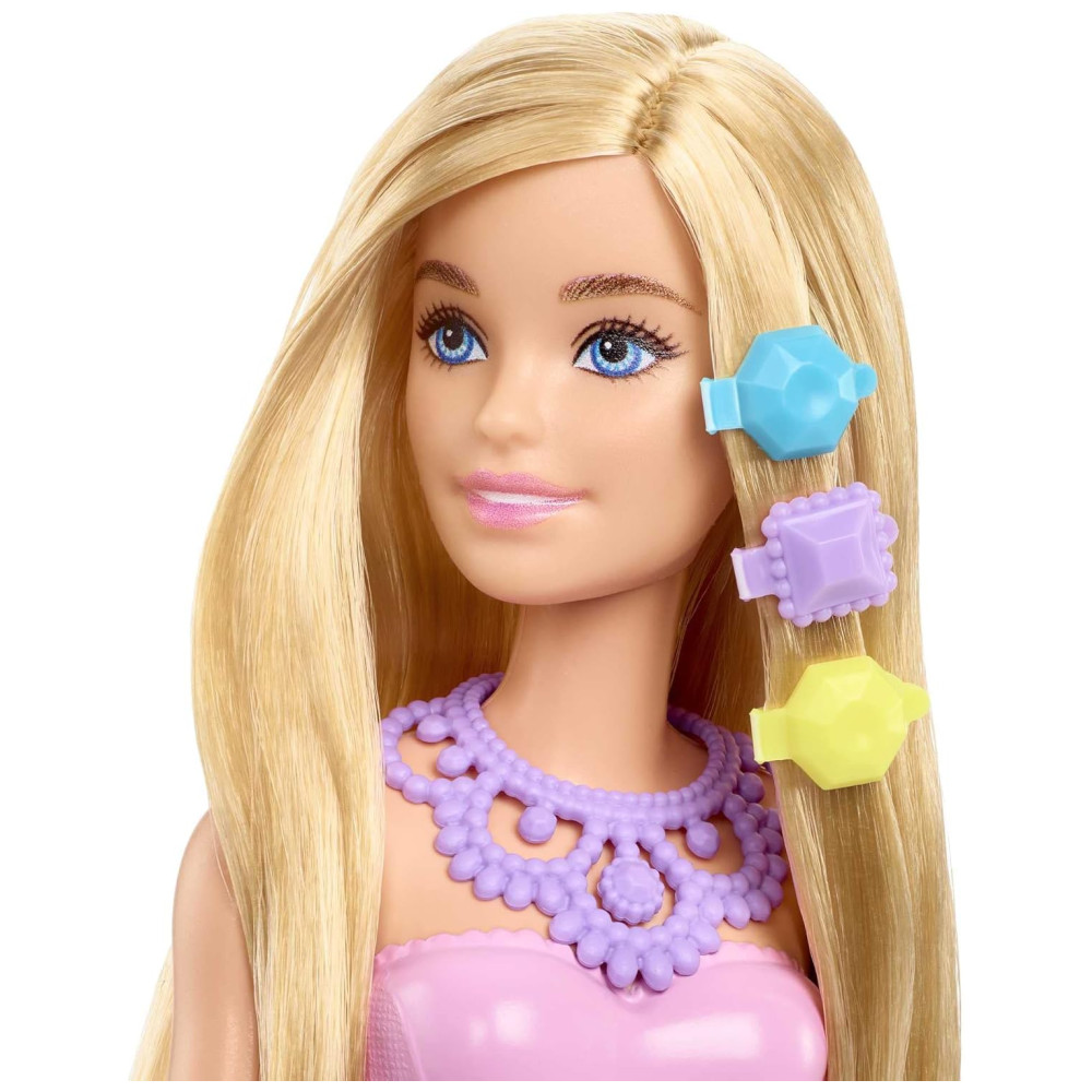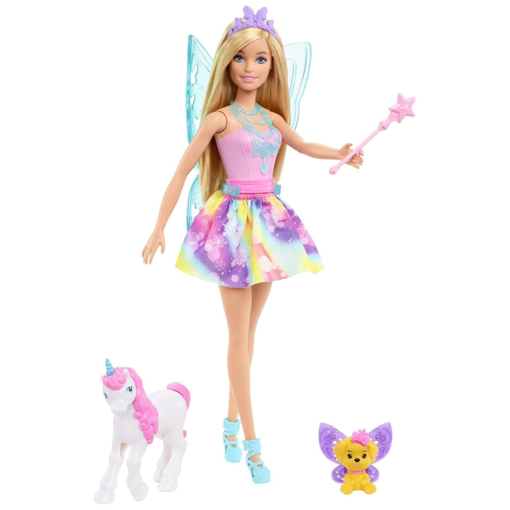Inclui boneca Barbie, 1 saia, 1 saia de fada, 1 rabo de sereia, 1 par de asas, 2 pares de sapatos, 3 tiaras, 3 colares, 1 varinha, 1 pente, 4 presilhas, 1 cachorrinho, 1 ursinho, 1 dragão, 1 unicórnio, 1 cama de estimação, 1 par de asas de animal de estimação, 1 bule de chá, 2 xícaras de chá e 1 mesa