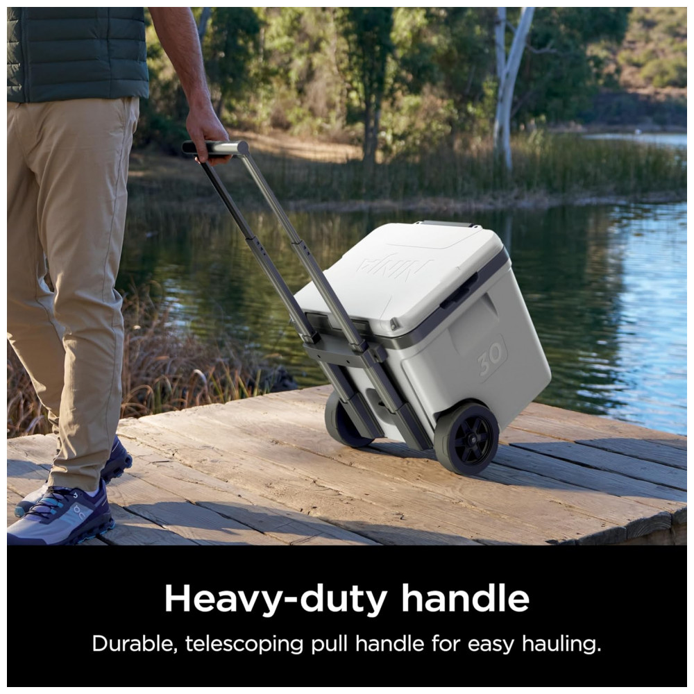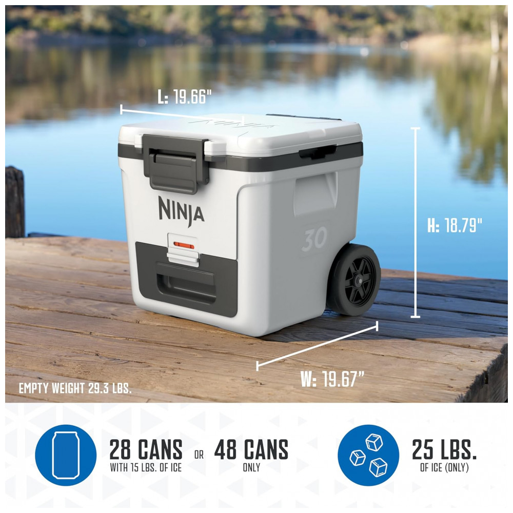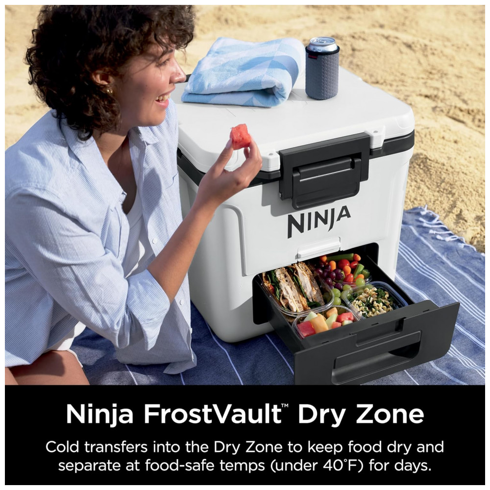 A caixa térmica com rodas Ninja FrostVault 30QT foi desenvolvida para conservação de bebidas e alimentos em ambientes externos, com isolamento de alto desempenho e gaveta inferior em zona seca refrigerada. A tecnologia FrostVault transfere o frio do compartimento principal para a gaveta Dry Zone, mantendo os alimentos frios, secos e separados do gelo, em faixa de temperatura segura abaixo de 4,5°C por vários dias quando utilizada com gelo adequado.