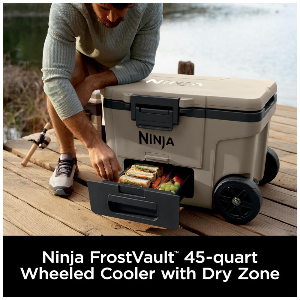 A caixa térmica com rodas Ninja FrostVault 45QT foi desenvolvida para conservação de alimentos e bebidas em ambientes externos, combinando isolamento de alta performance com gaveta inferior em zona seca refrigerada. A tecnologia FrostVault direciona o frio do compartimento principal para a gaveta, mantendo os alimentos separados do gelo e da água, em temperatura segura abaixo de 4,5°C por vários dias quando utilizada com gelo adequado.