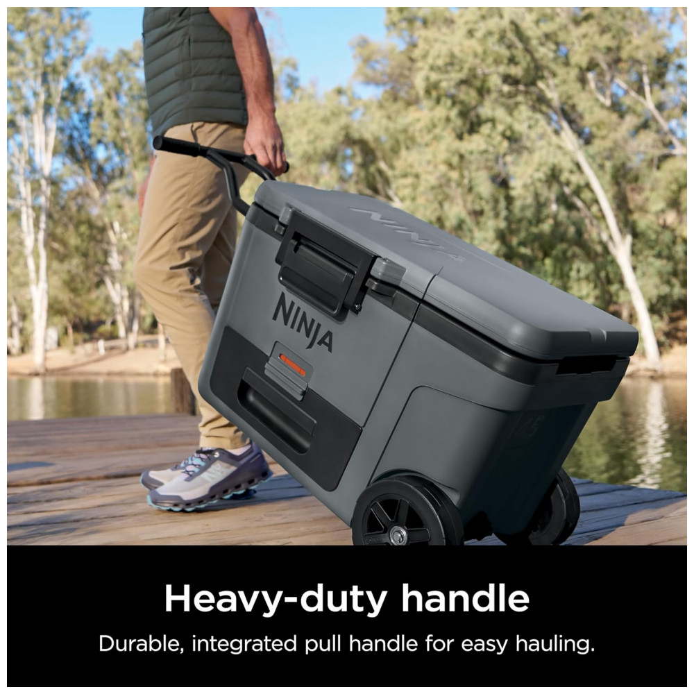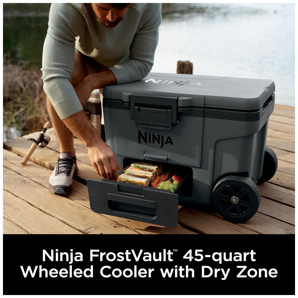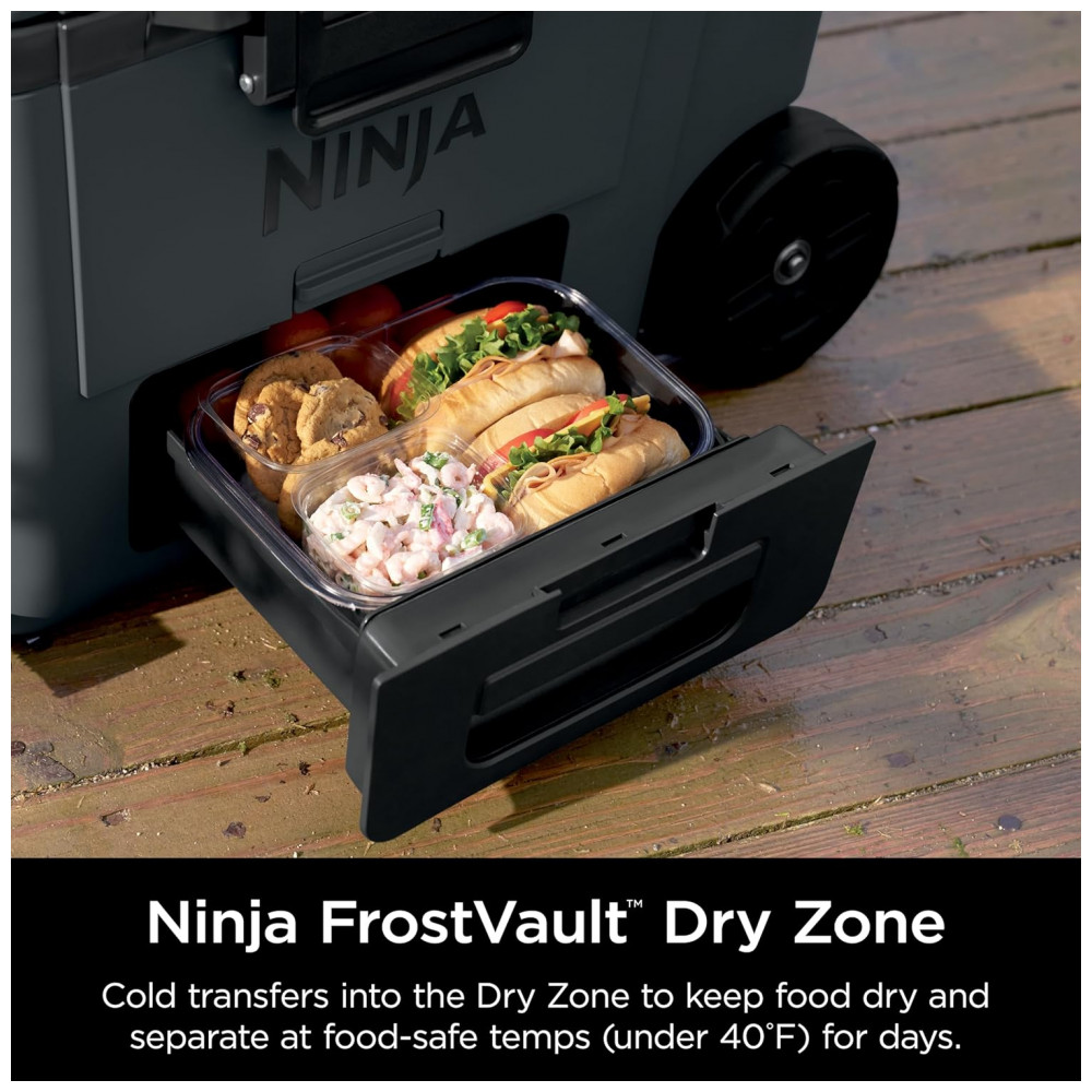 A caixa térmica com rodas Ninja FrostVault 45QT foi desenvolvida para conservação de alimentos e bebidas em ambientes externos, combinando isolamento de alta performance com gaveta inferior em zona seca refrigerada. A tecnologia FrostVault direciona o frio do compartimento principal para a gaveta, mantendo os alimentos separados do gelo e da água, em temperatura segura abaixo de 4,5°C por vários dias quando utilizada com gelo adequado.