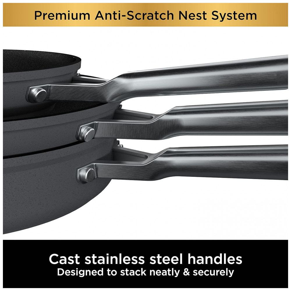 ZENAMENTO O design exclusivo de nidificação anti riscos protege panelas e frigideiras durante o zenamento, suspendendo as com alças de empilhamento especialmente projetadas.