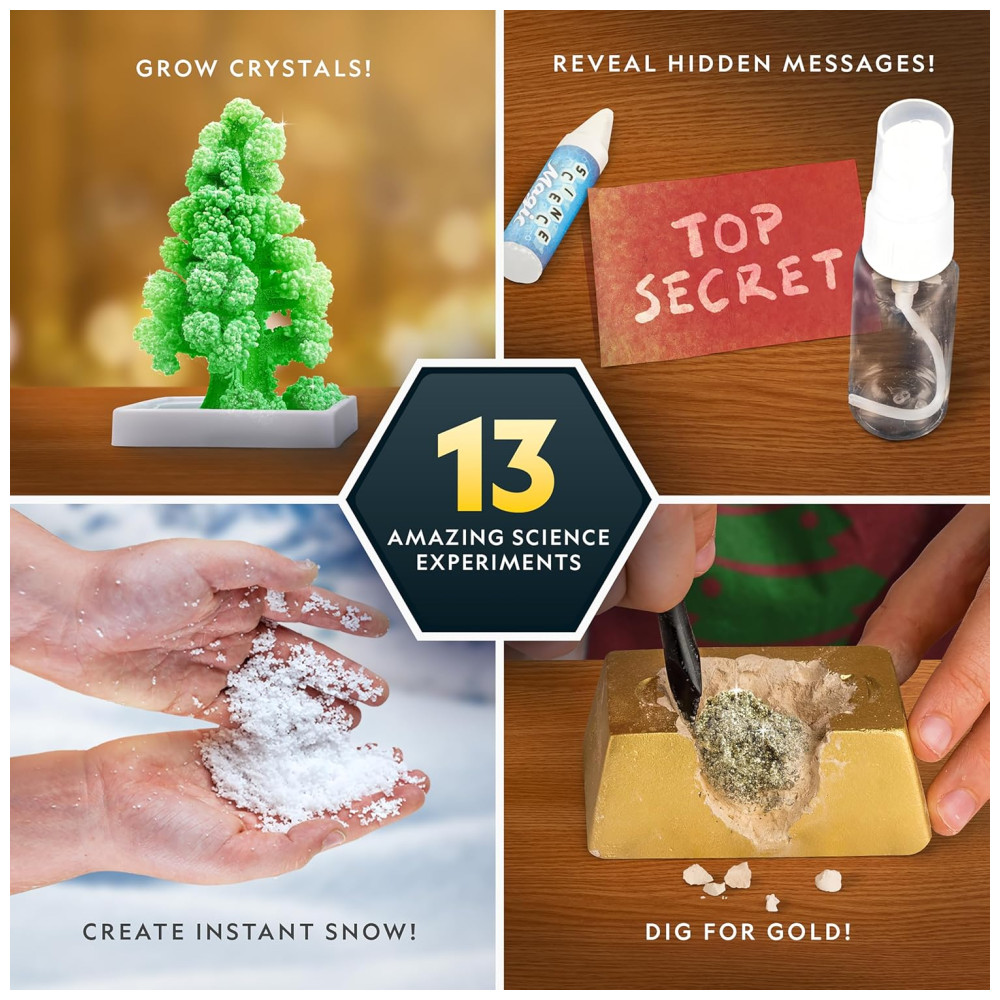 REALIZE 13 EXPERIMENTOS DIVERTIDOS Selecionamos 13 experimentos incríveis de nossos kits científicos para este calendário do advento. As crianças vão adorar esconder, revelar uma mensagem secreta, fazer brilhar um tubo de ensaio, moedas flutuantes, cultivar uma árvore de cristal colorida e muito mais