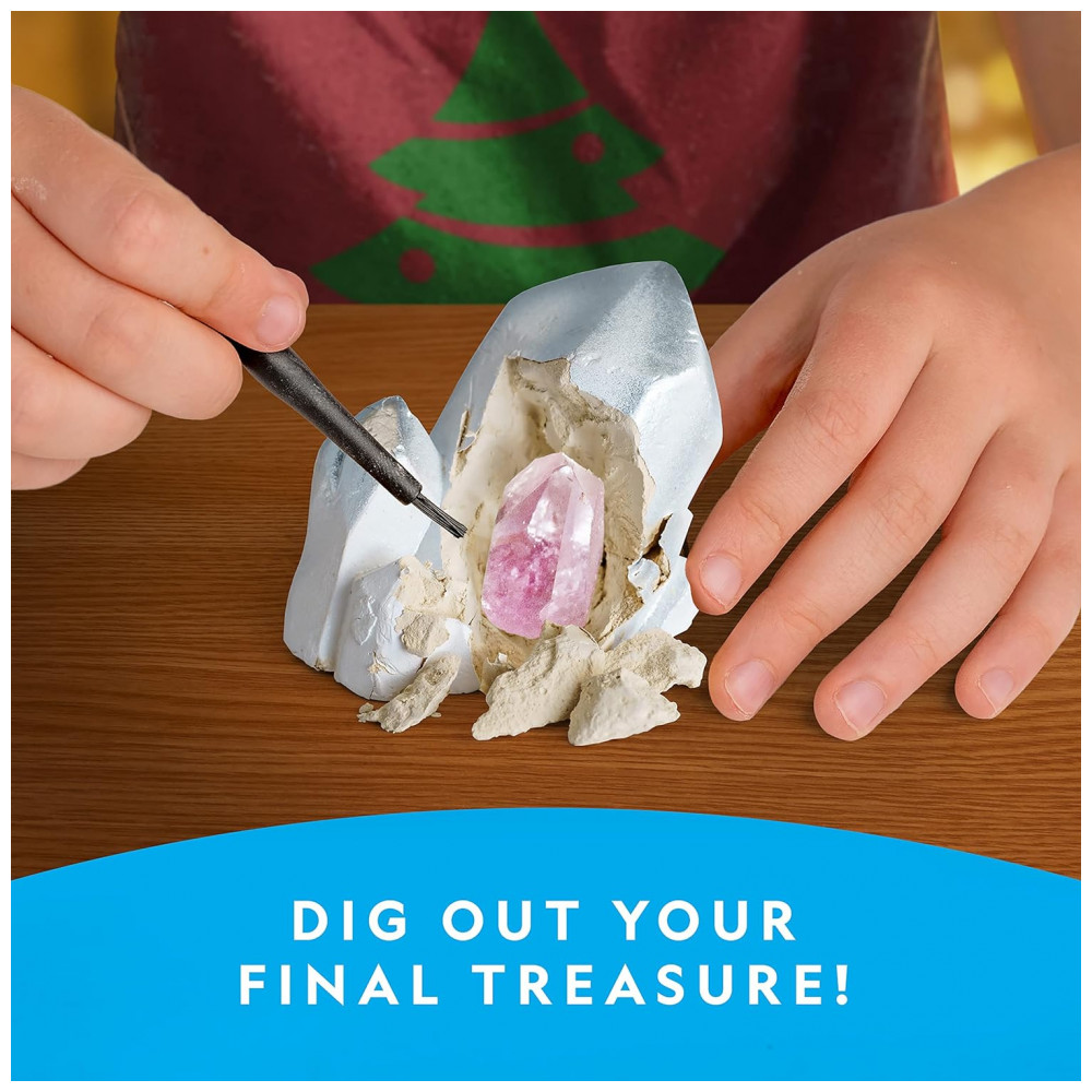 DIG OUT A SPECIAL CRYSTAL ON THE FINAL DAY A peça final desta coleção é um impressionante espécime de Quartzo Rosa que as crianças descobrirão de um tijolo de mini escavação. Ferramenta de escavação e pincel incluído, com uma lupa para olhar todas as peças de perto
