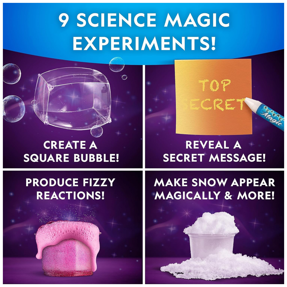 CONDUZA 9 EXPERIMENTOS CIENTÍFICOS INCRÍVEIS A magia continua com 9 experimentos científicos que também irão surpreender e surpreender o público Crie uma bolha quadrada, revele uma mensagem secreta, faça aparecer neve mágica, faça moedas flutuarem na água e muito mais