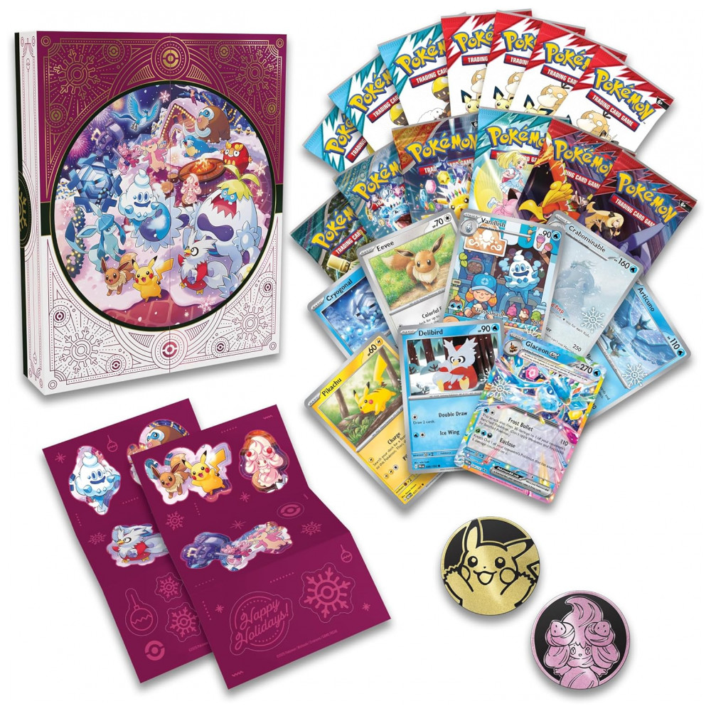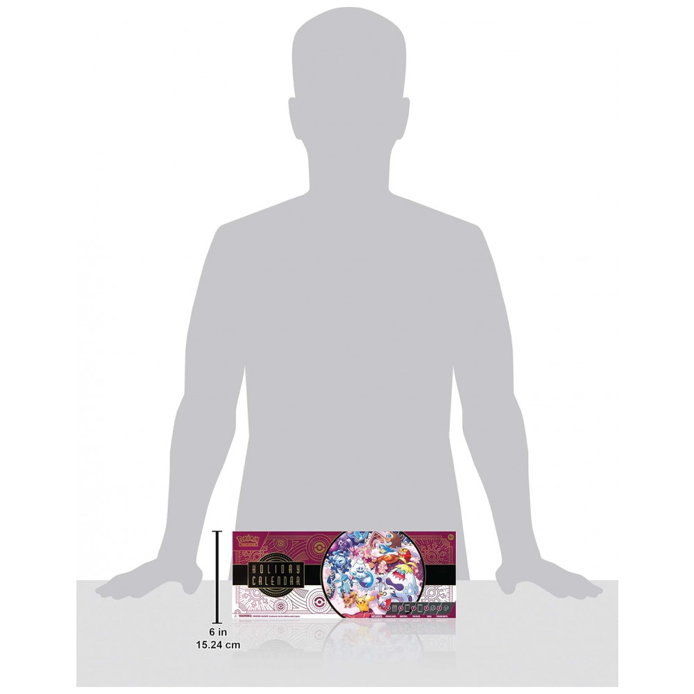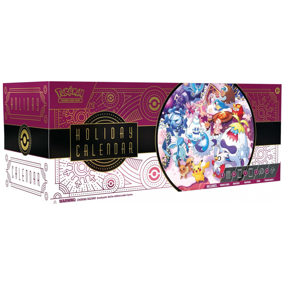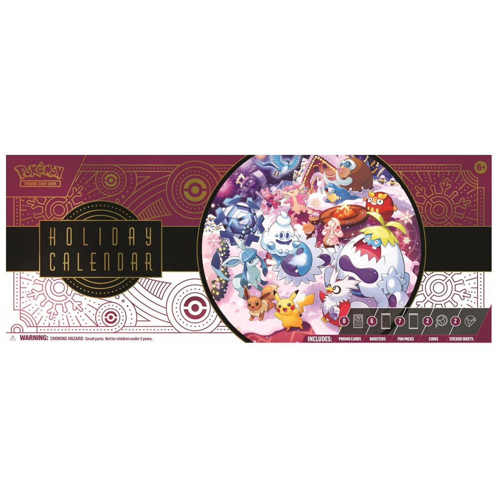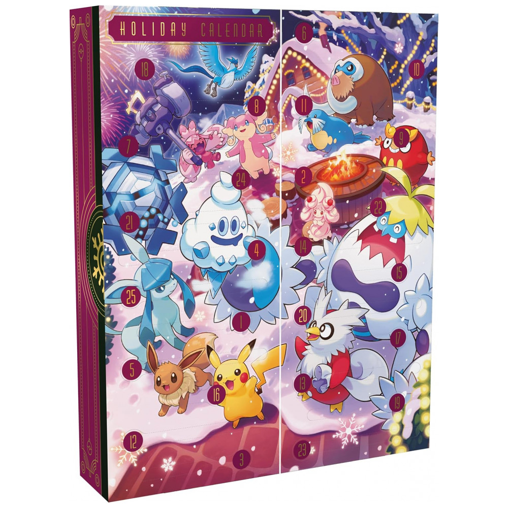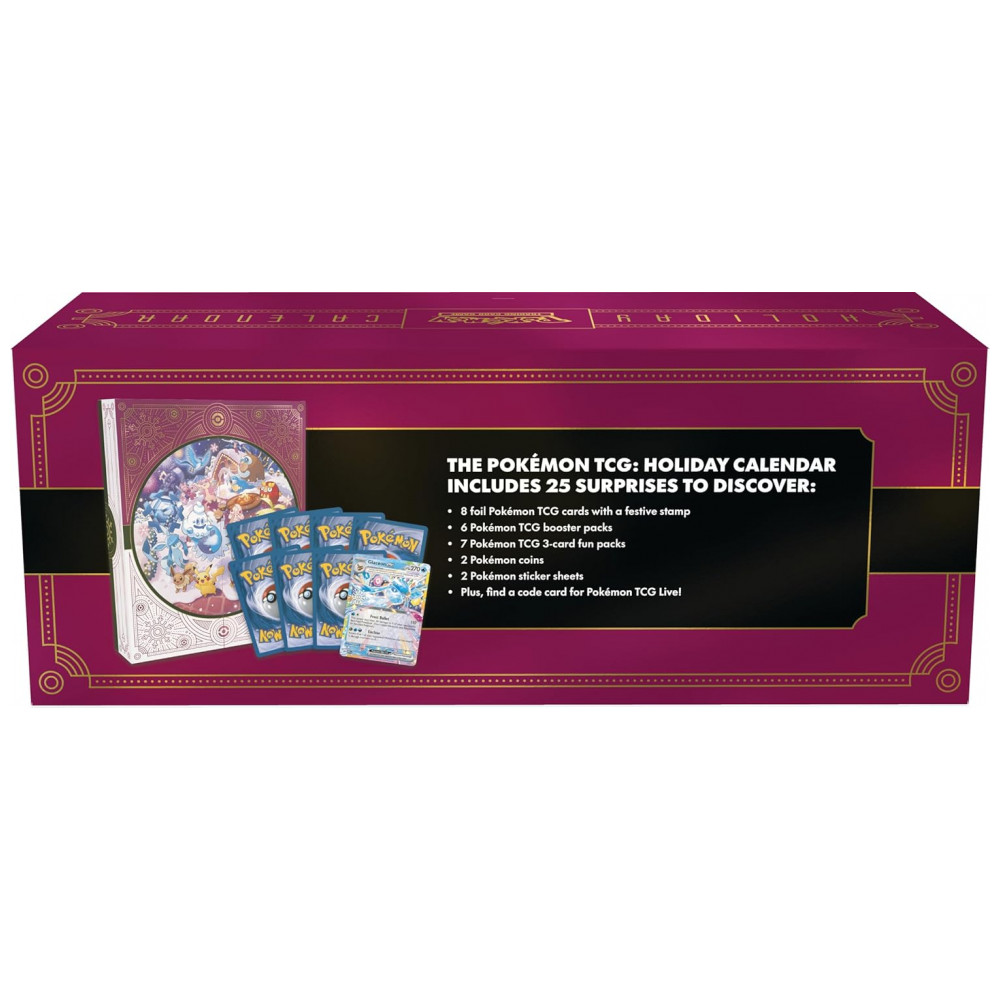Cada unidade do calendário inclui oito cartas foil de Pokémon TCG com estampa temática de fim de ano, seis boosters com dez cartas por pacote e sete fun packs com três cartas cada. Também são incluídas duas moedas de Pokémon, duas folhas de adesivos e um código para uso no Pokémon TCG Live, permitindo acesso a conteúdo digital complementar.
