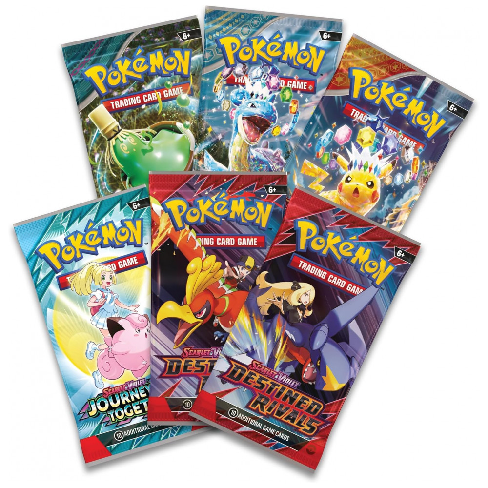 Conteúdo – boosters padrão: 6 boosters Pokémon TCG com 10 cartas cada
