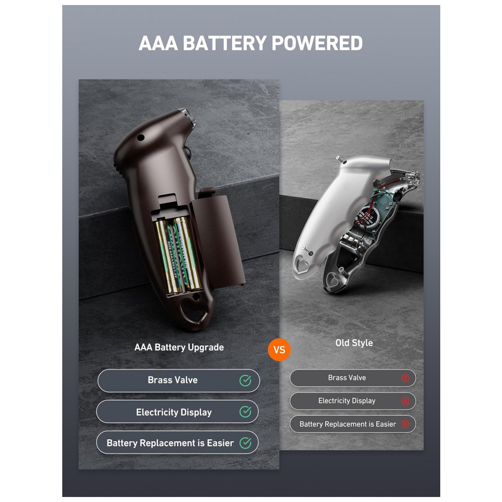 Este Calibrador de Pressão de Pneus foi aprimorado com fonte de alimentação substituível por bateria AAA, proporcionando maior praticidade. Incluindo 2 pilhas AAA, é fácil para qualquer pessoa fazer a substituição, sendo que as pilhas AAA duram mais do que as de moeda. Ideal para presentear homens e mulheres, o bico forma facilmente vedação com válvulas Schrader e Presta (com adaptador), oferecendo leituras rápidas e precisas em incrementos de 0,1. Com 4 configurações de medida, variando de 0 a 150 PSI, 0 a 10 Bar, 0 a 10 Kgf/cm² ou 0 a 1000 KPA. Basta pressionar o botão “ON/UNIT/OFF” para ligar a ferramenta, selecionar a escala desejada e desligar automaticamente em 30 a 40 segundos para economizar energia. Sua textura antiderrapante facilita a pegada, sendo ergonômico para mãos masculinas e femininas. Projetado para manter a pressão correta dos pneus, reduzir o desgaste e prolongar sua vida útil, com leitura digital instantânea e clara no visor. Pilhas inclusas. Um presente perfeito de acessório automotivo para homens. Versátil para uso em carros, caminhões, motos, bicicletas, etc.