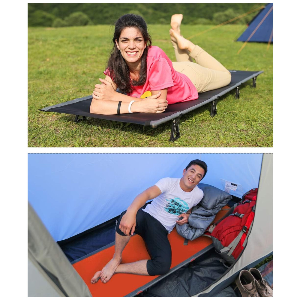 FORTE E ESTÁVEL A estrutura da cama é feita de liga de alumínio aéreo antiferrugem e de alta resistência com grande capacidade de carga 120kg, 265lbs. Todos os pés da estrutura dos berços de acampamento são projetados com pés de plástico antiderrapantes com mais espaço de suporte e encaixe no chão. O material superior é tecido de poliéster 420D, anti rasgo e respirável.