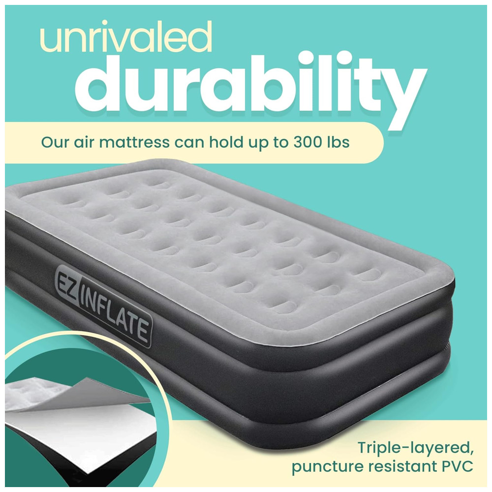 Uma boa noite de sono não deve custar caro o colchão de ar EZ INFLATE oferece uma noite de sono confortável a um preço acessível. Este colchão inflável pode conter até 272 kg e é construído em PVC durável e resistente a perfurações.