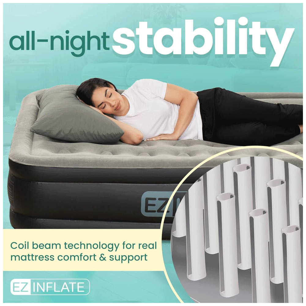 Não economizamos espaço as camas queen size com colchão de ar EZ INFLATE são projetadas para maximizar o espaço para dormir. As medições são de ponta a ponta na parte superior flocada macia e não nas bordas arredondadas do colchão de ar. Isso significa que você terá mais espaço para dormir. Nosso airbed queen size mede uma superfície completa de 80 x 60. Por dentro, a tecnologia de feixe de bobina fornece o nível perfeito de estabilidade e suporte para uma ótima noite de sono.