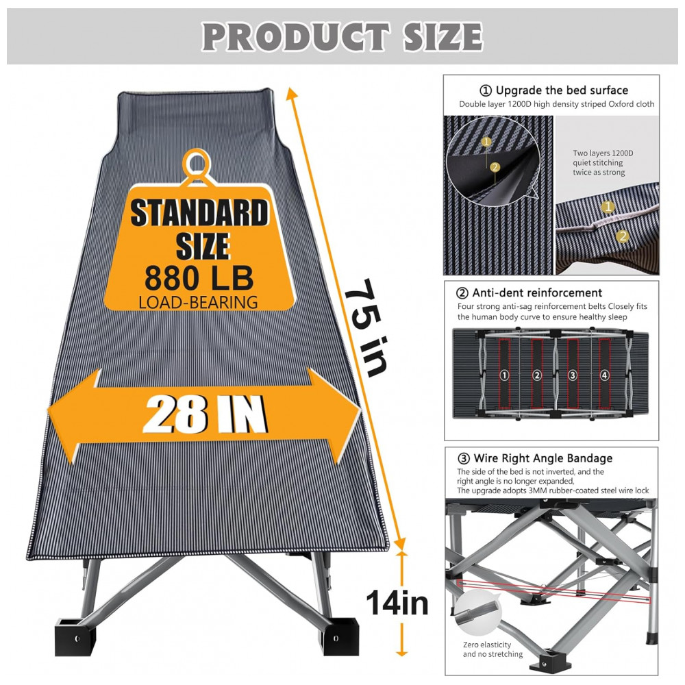 A cama de acampamento para adultos é feita de uma estrutura quadrada de aço antiferrugem, suporta até 408,23 kg, que é resistente o suficiente para suportar 1 adulto ou 2 crianças dormindo nela para descansarita