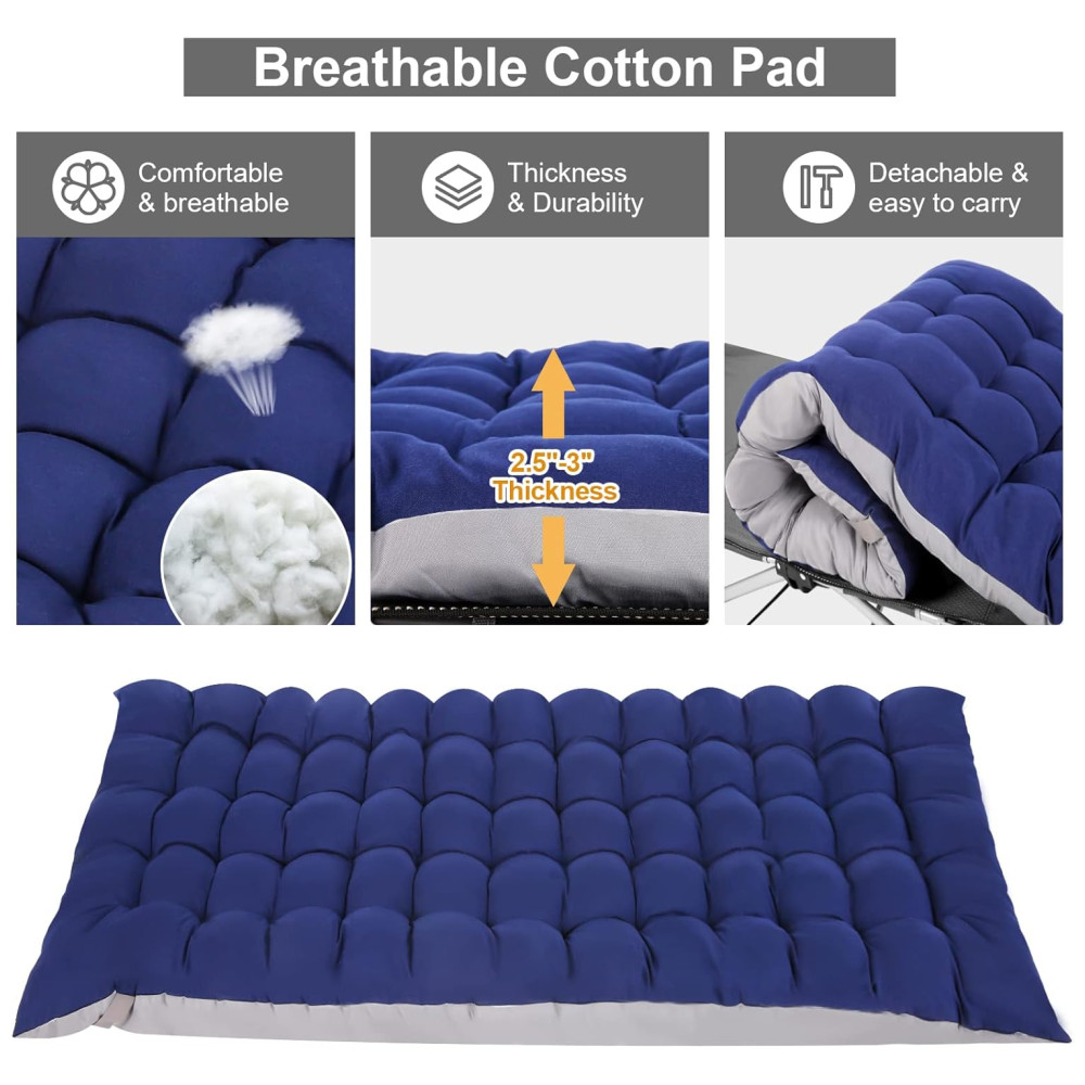 Nossa cama de camping está equipada com uma almofada de algodão pérola removível, projetada com uma alça de mola para fixá la, o colchão é confortável e respirável. Equipado com bolsos laterais para guardar facilmente seu telefone, óculos, livros e muito mais.