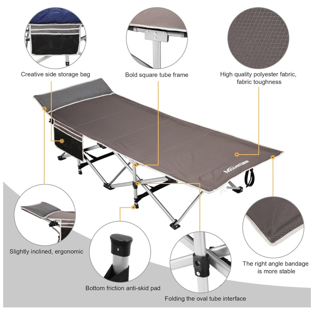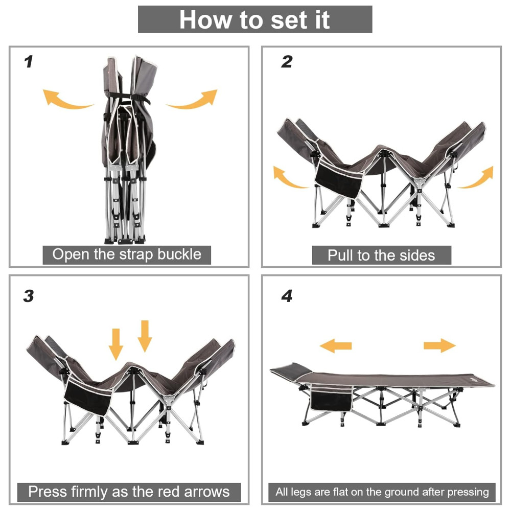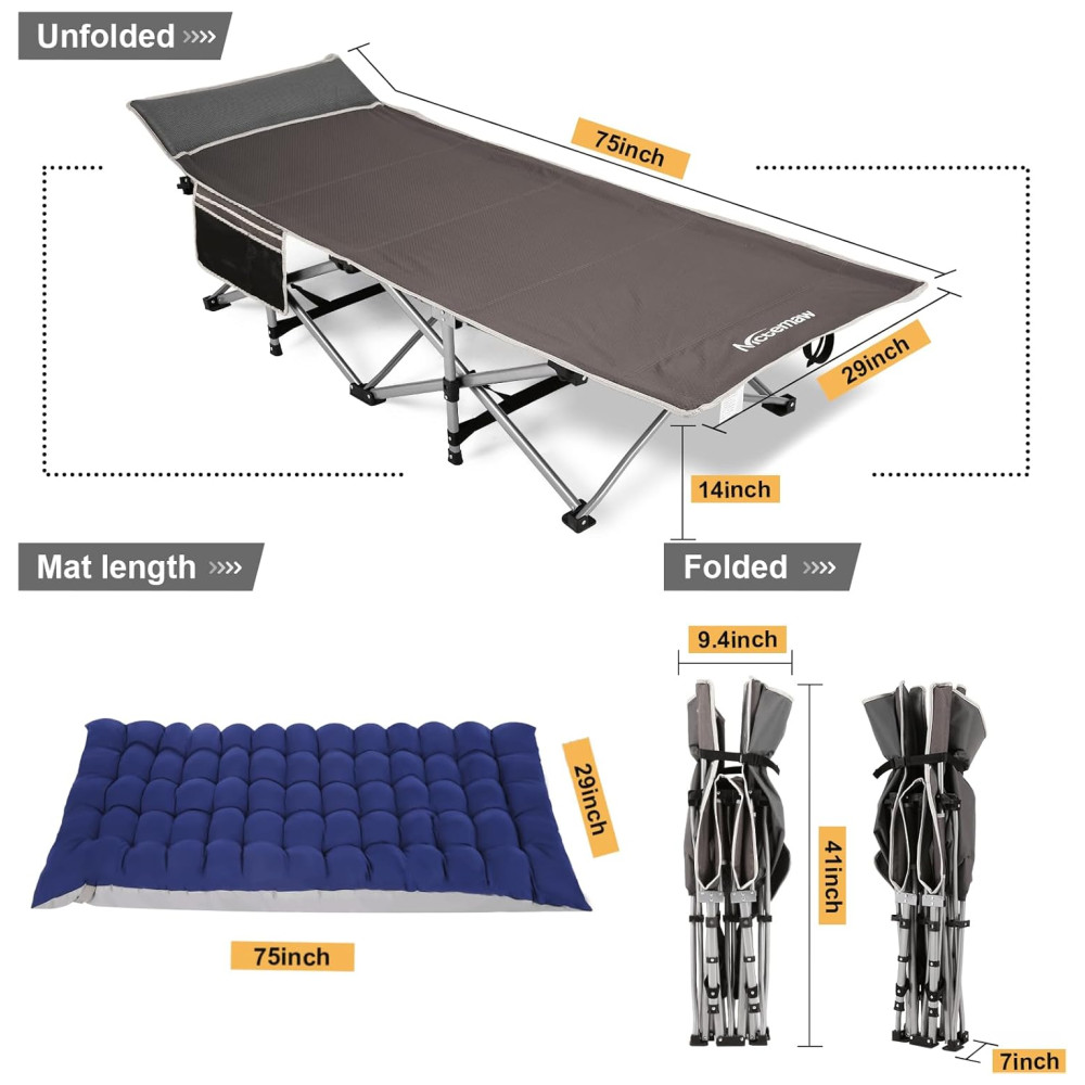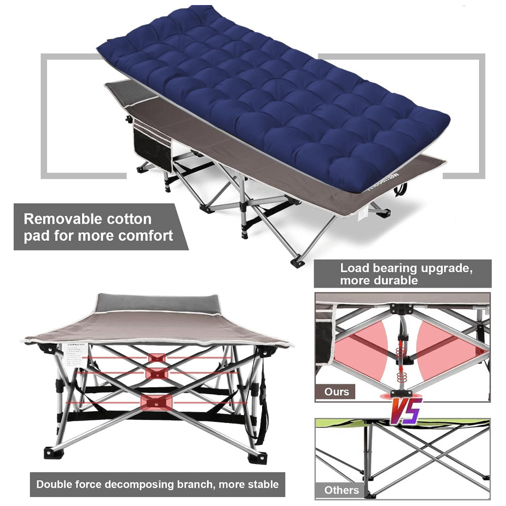 A estrutura da cama de acampamento é reforçada e super construída, a estrutura resistente de aço de tubo quadrado atualizado e as juntas grossas tornam esta cama dobrável mais durável e estável para garantir robustez máxima, até 408,2 kg. A cama dobrável é feita de tecido Oxford 1200D de camada dupla, que tem boa resistência, é fácil de limpar, dobra sem vincos e é durável.