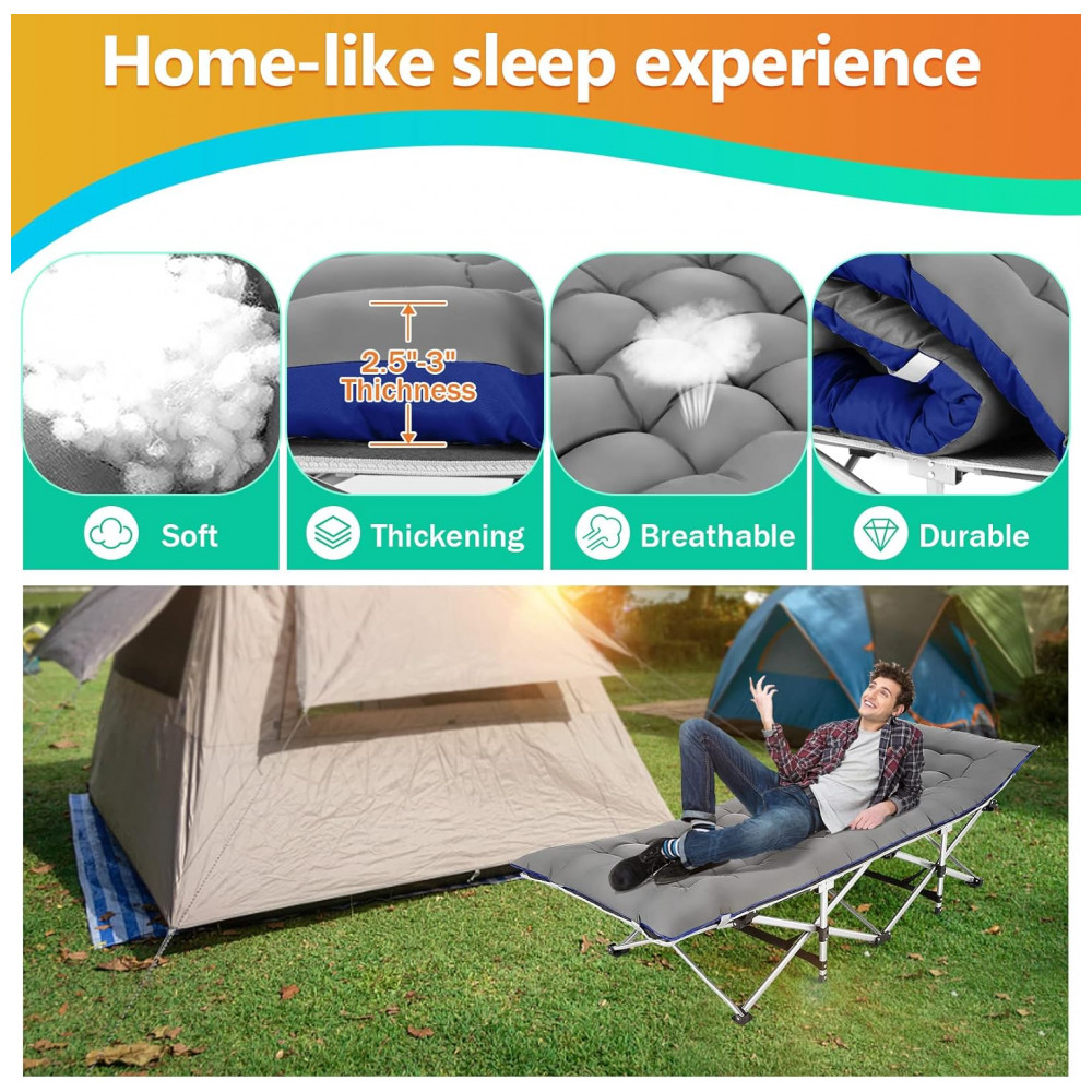 Colchão confortável O colchão da cama de camping é feito de algodão macio pérola e é muito confortável. O elástico nos quatro cantos garante que a almofada se adapte bem.