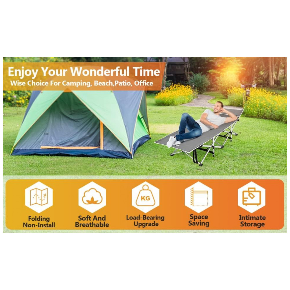 Cama dobrável estrutura em tubo de aço resistente e juntas dobradas em segundos para fácil zenamento e viagem vem com bolsa de zenamento para fácil transporte e zenamento. Perfeito para sua próxima viagem, casa, escritório, piscina, lago, trailer, acampamento, pátio, barraca ou cabana para relaxar.