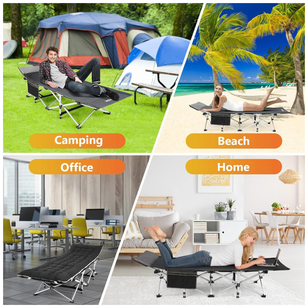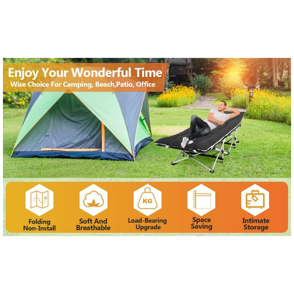 Cama dobrável estrutura em tubo de aço resistente e juntas dobradas em segundos para fácil zenamento e viagem vem com bolsa de zenamento para fácil transporte e zenamento. Perfeito para sua próxima viagem, casa, escritório, piscina, lago, trailer, acampamento, pátio, barraca ou cabana para relaxar.