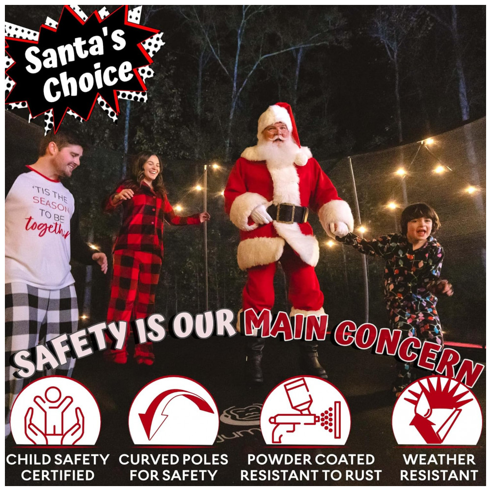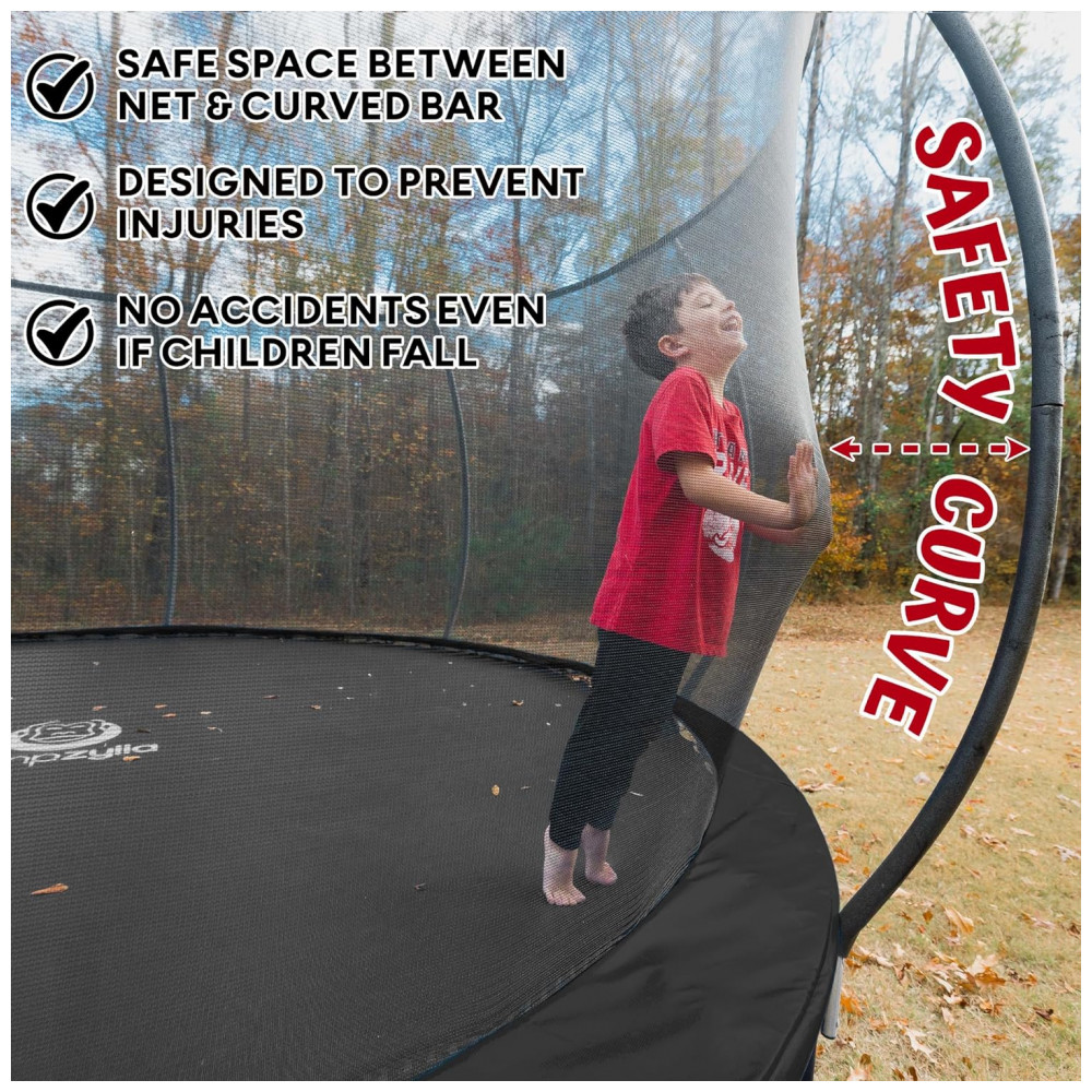 Diversão e segurança do seu filho Nossa responsabilidade Para a segurança de seus filhos, inovamos nossos trampolins de 4,2 metros com bastões curvos inovadores projetados para proteger seus filhos de acidentes ou lesões. Os trampolins Jumpzylla estão em conformidade com a especificação de segurança padrão ASTM F381 16, somos extremamente exigentes quando se trata de segurança para crianças.