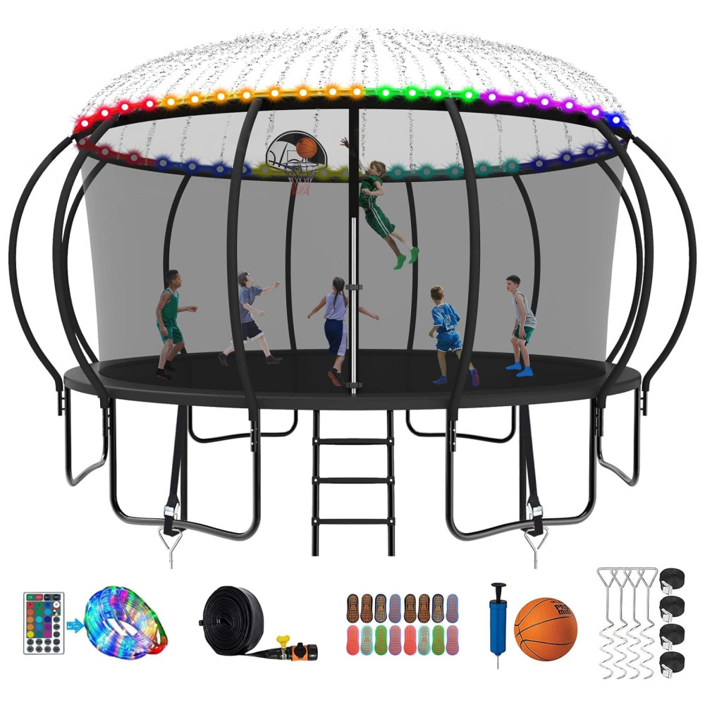 Design sem porcaria Este trampolim pode facilmente acomodar uma família de 5 a 6 pessoas, este trampolim de 4,27 metros de largura pode suportar mais de 544 kg. Este trampolim de quintal é um trampolim de mastro curvo com design de rede interna. A rede de proteção envolveu todo o trampolim e a almofada de cobertura de mola é colocada na rede, o que elimina as lacunas entre o tapete e a rede para evitar lesões.
