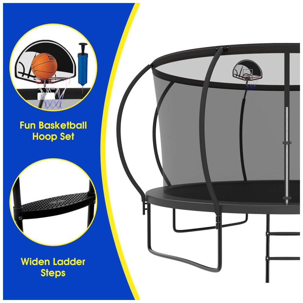 Capacidade de peso de 544 kgEste trampolim resistente de 2023 é feito de aço galvanizado de espessura pulverizada preta. O aço galvanizado tem a característica de durabilidade que faz com que não quebre por mais de 20 anos. Comparado com outros aços usuais, o aço galvanizado é mais estável, brilhante e mais confiável.