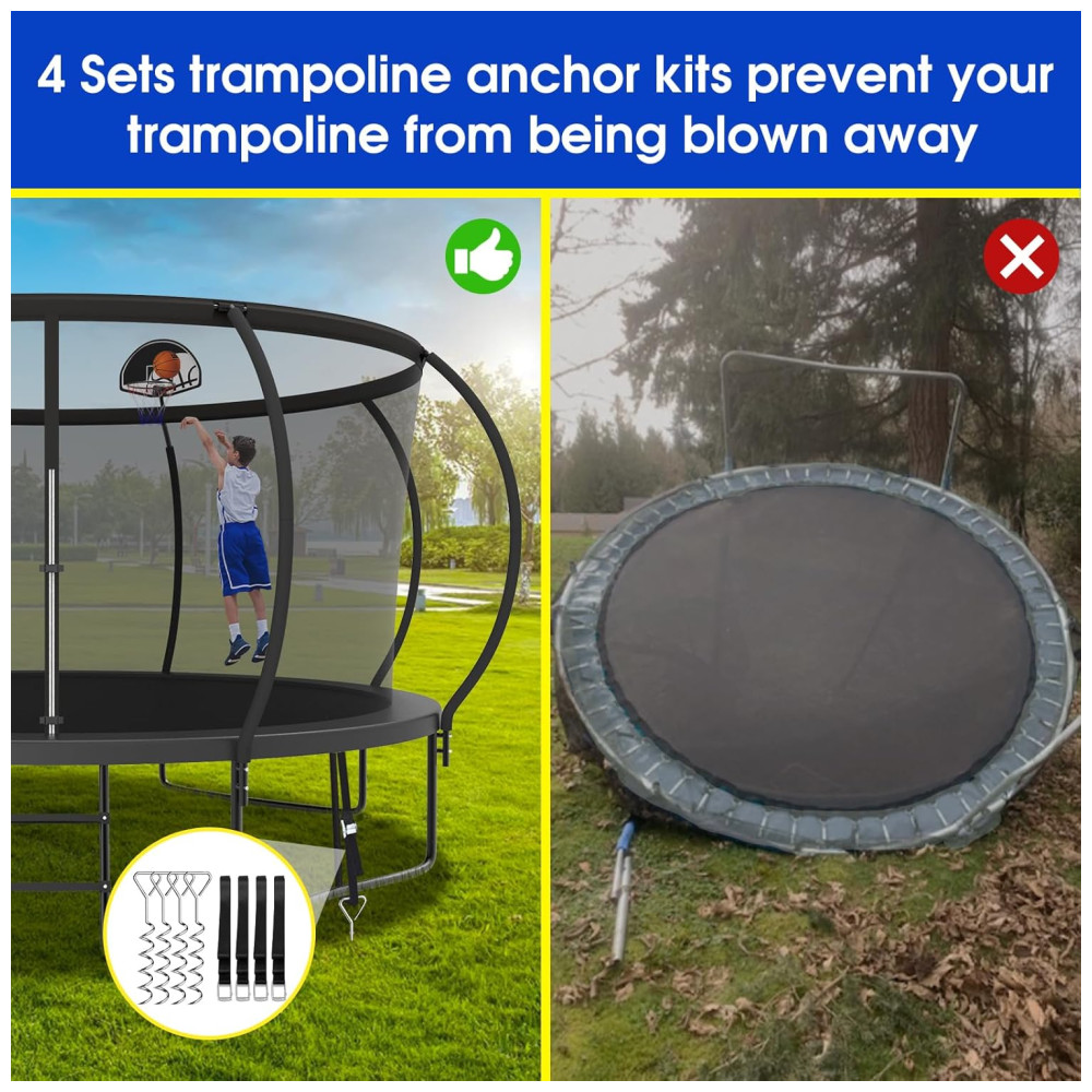 Proteção segura de 360 A segurança é sempre nosso primeiro objetivo perseguido. E temos tomado mais medidas sobre isso agora ou no futuro. Cada trampolim tem mangas de pólo de 8 peças. Os postes do gabinete são acolchoados com espuma de , que pode proteger seus filhos de bater contra o poste de aço.