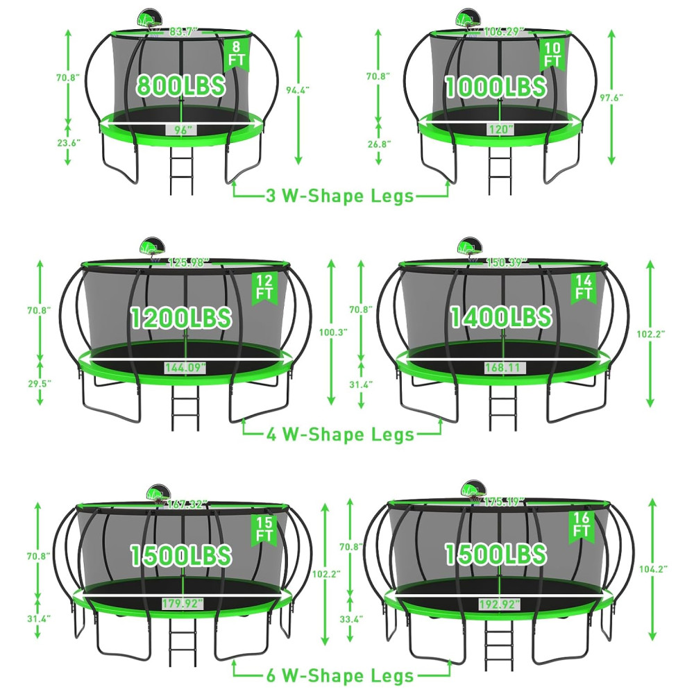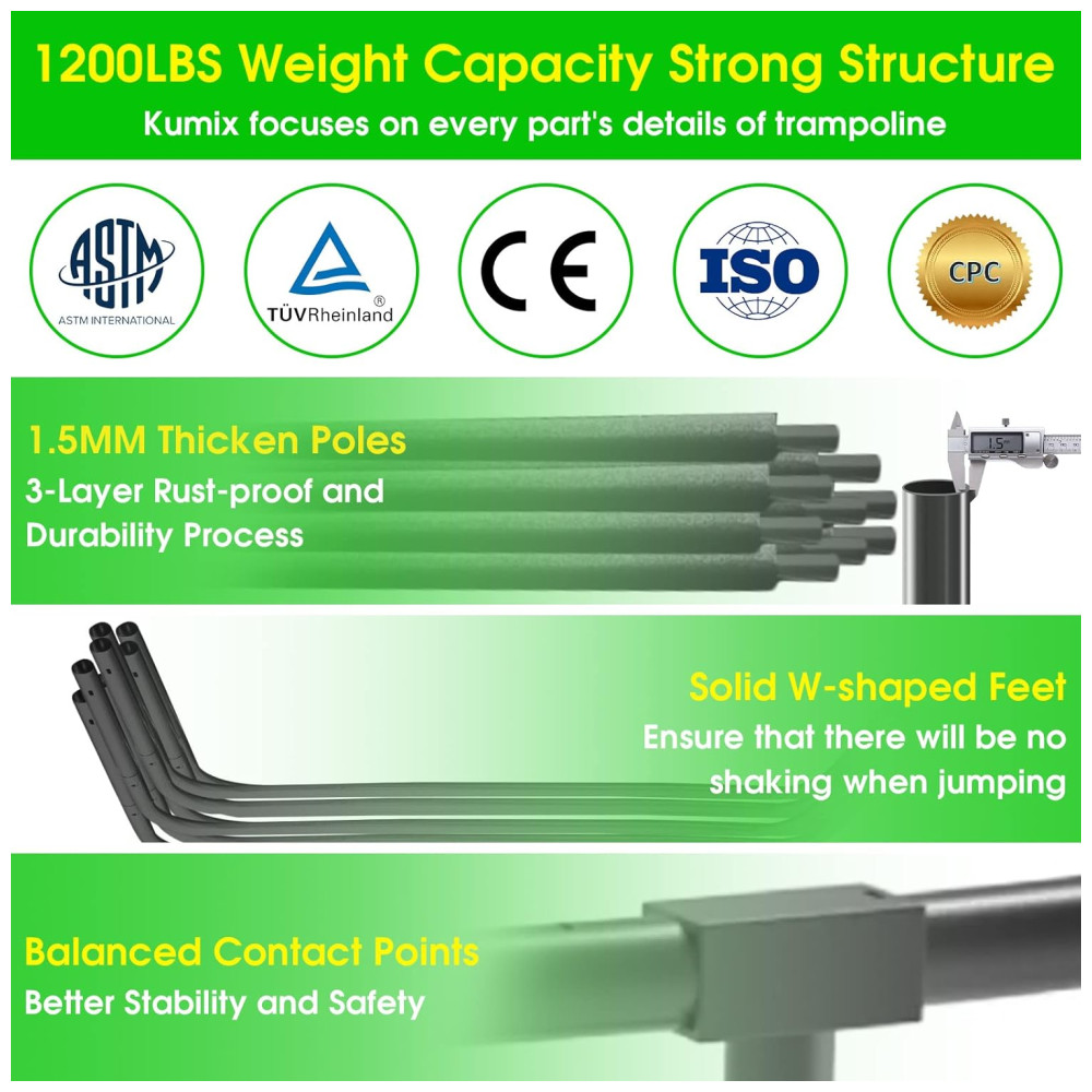 Capacidade de peso de 544 kgEste trampolim resistente de 2023 é feito de aço galvanizado de espessura pulverizada preta. O aço galvanizado tem a característica de durabilidade que faz com que não quebre por mais de 20 anos. Comparado com outros aços usuais, o aço galvanizado é mais estável, brilhante e mais confiável.