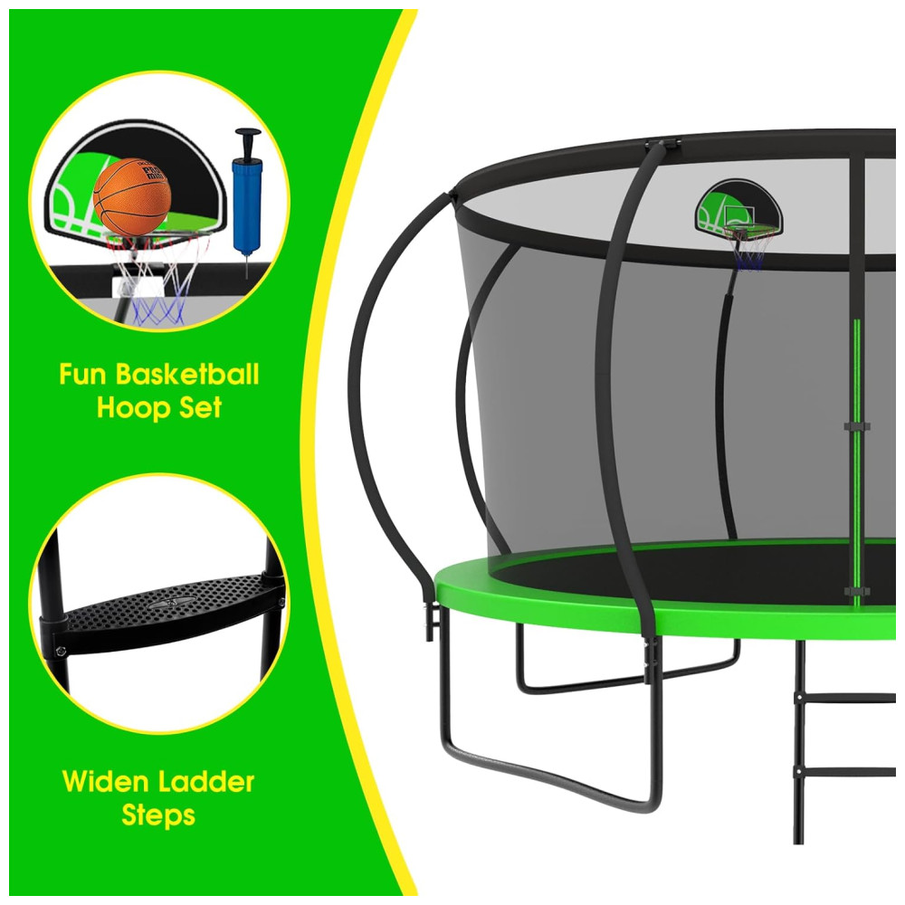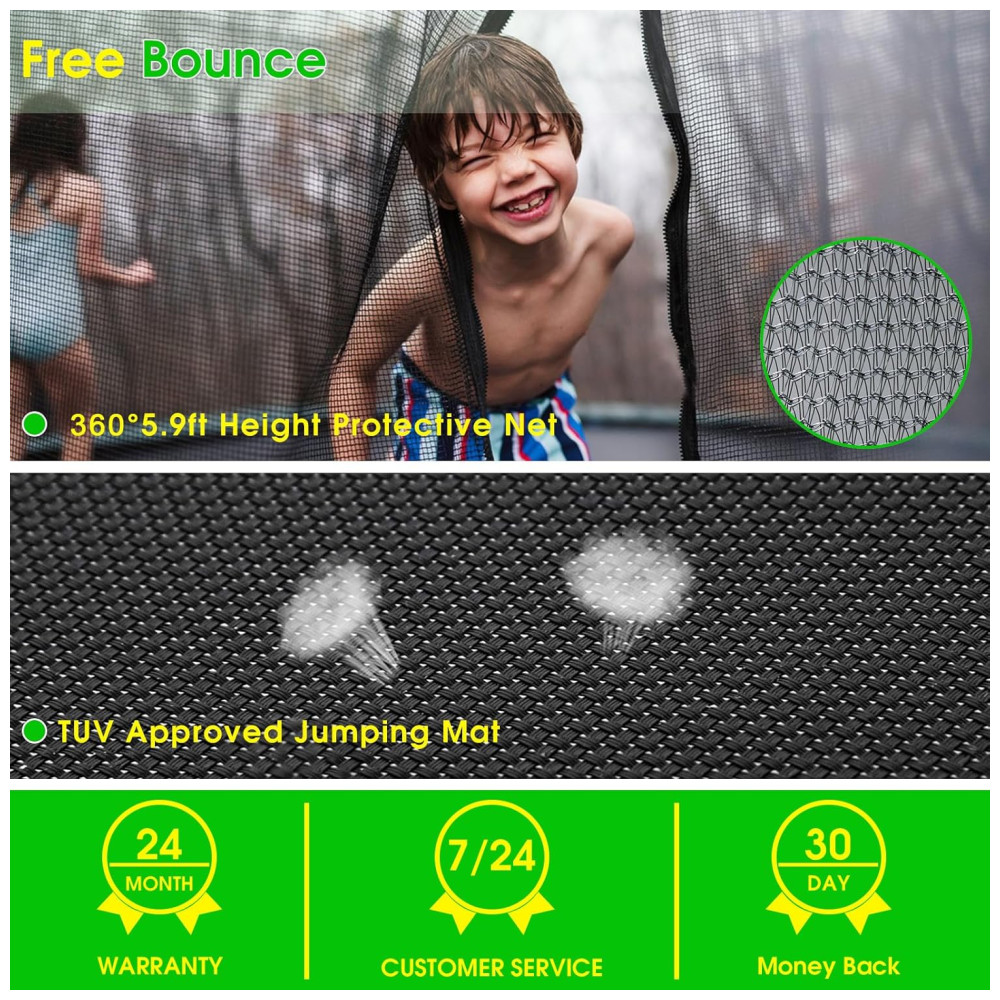 Design sem porcaria Este trampolim pode facilmente acomodar uma família de 5 a 6 pessoas, este trampolim de 4,27 metros de largura pode suportar mais de 544 kg. Este trampolim de quintal é um trampolim de mastro curvo com design de rede interna. A rede de proteção envolveu todo o trampolim e a almofada de cobertura de mola é colocada na rede, o que elimina as lacunas entre o tapete e a rede para evitar lesões.