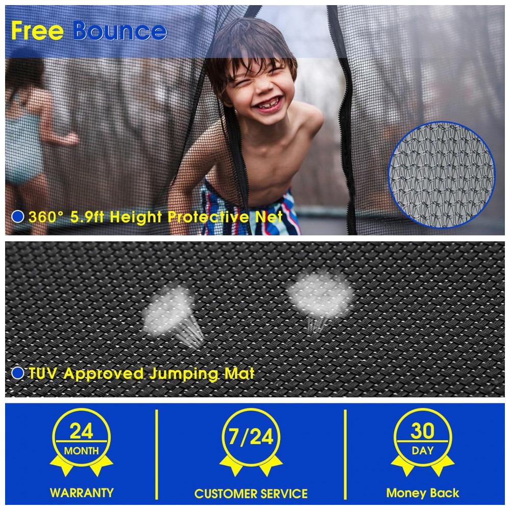 Design sem porcaria Este trampolim pode facilmente acomodar uma família de 6 a 7 pessoas, este trampolim de 4,27 metros de largura pode suportar mais de 635 kg. Este trampolim de quintal é um trampolim de mastro curvo com design de rede interna. A rede de proteção envolveu todo o trampolim e a almofada de cobertura de mola é colocada na rede, o que elimina as lacunas entre o tapete e a rede para evitar lesões