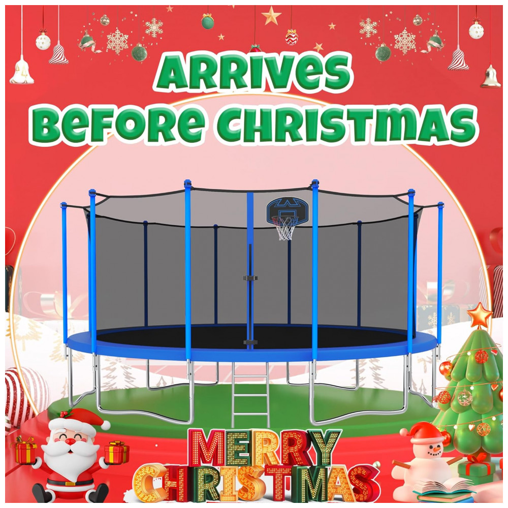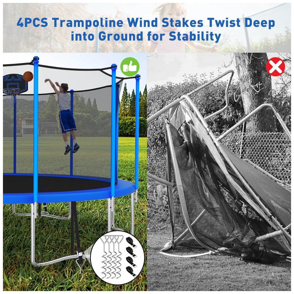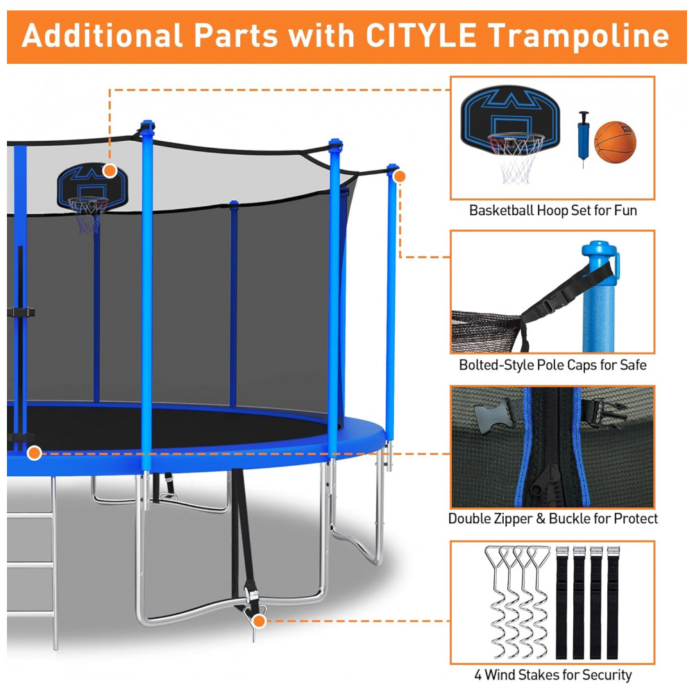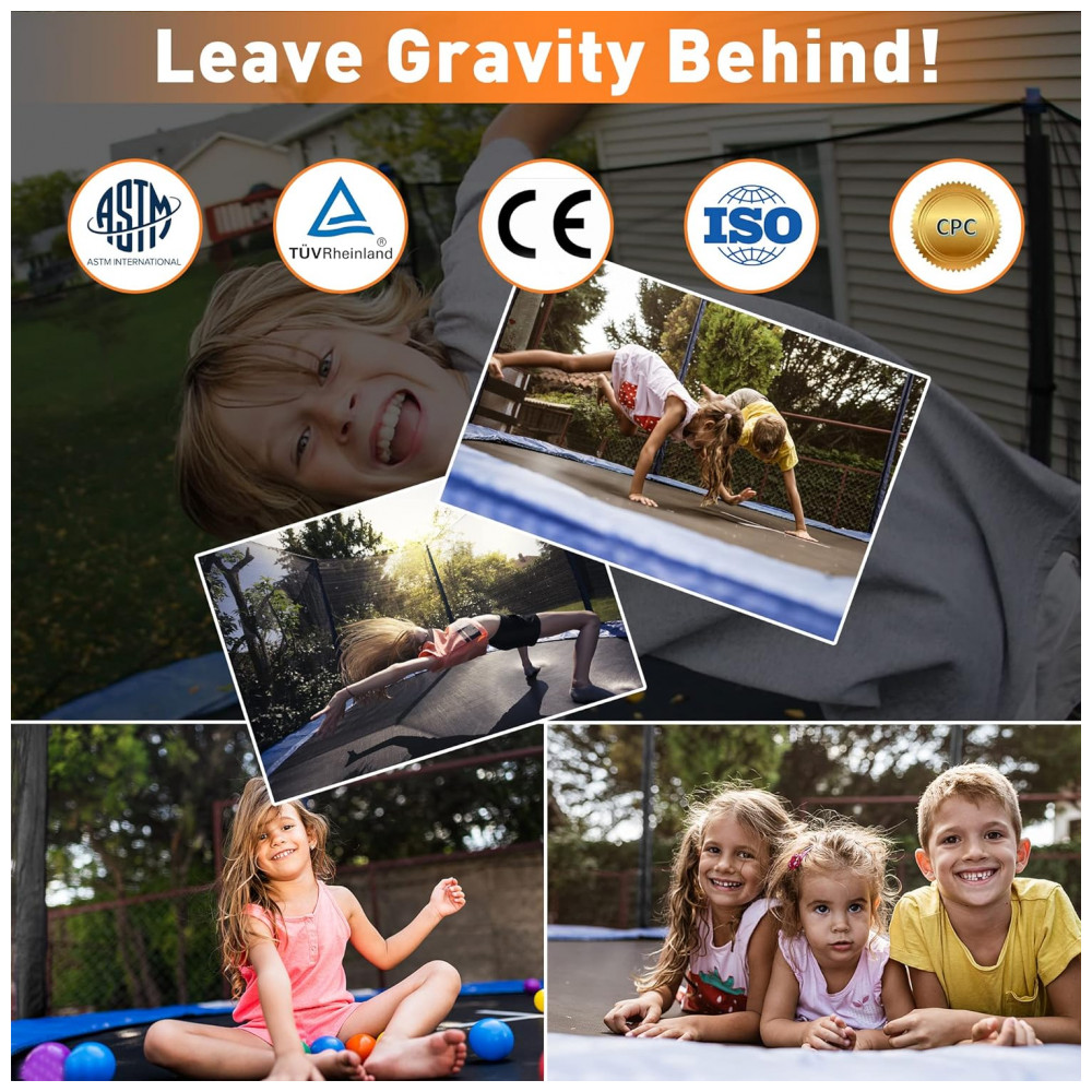 Estrutura sólida12 pólos acolchoados de espuma para suportar a rede de proteção de trampolim de segurança à prova de UV para máxima segurança durante o salto. A escada de aço galvanizado de 3 degraus para serviço pesado oferece manobrabilidade conveniente dentro e fora do trampolim.